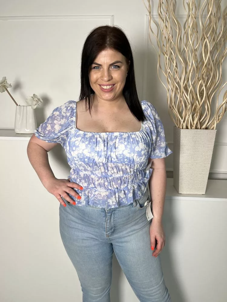 Missguided (L) Kék-Fehér Mintás, Kívül Hálós Anyagú Bélelt, Gumírozott, Kocka Kivágású Felső