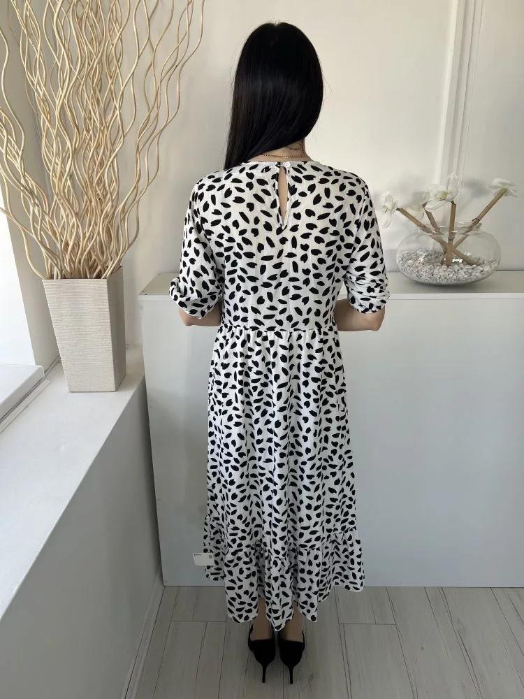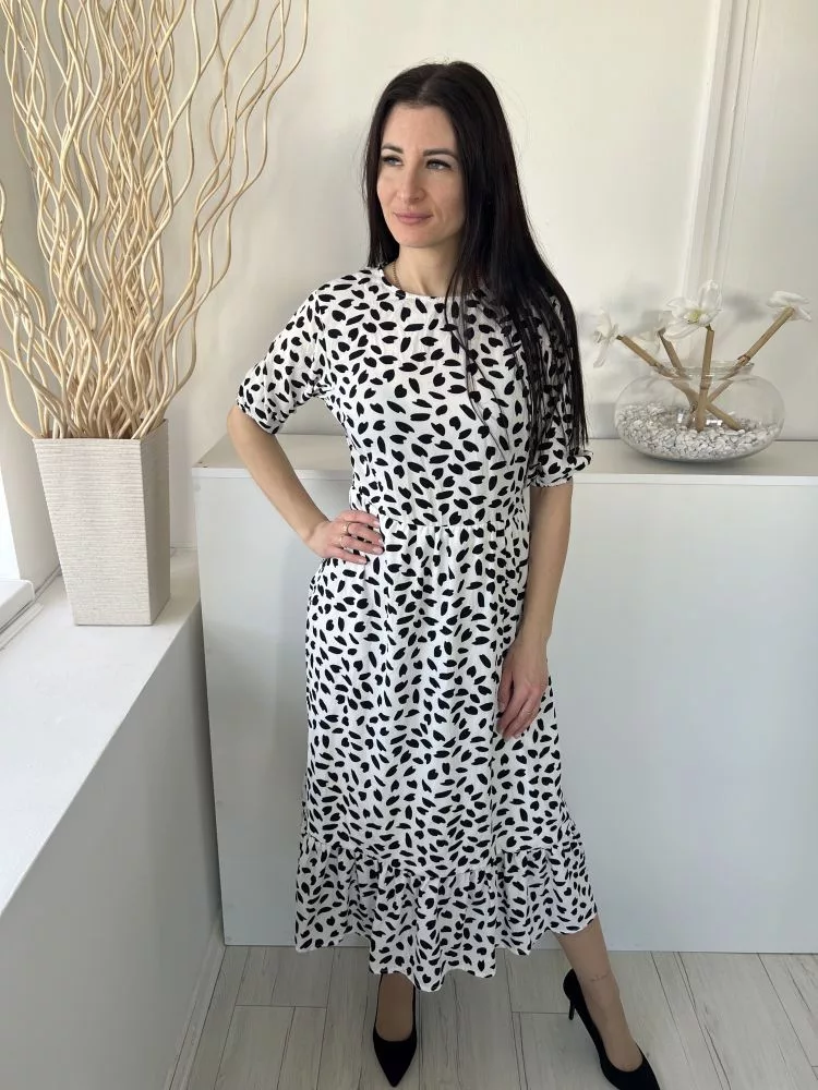 Missguided (XS) Fehér Fekete Foltmintás, Gumisderekú Hátul Nyakban Gombos, Fodros Aljú, Oldalt Cipzáros Ruha