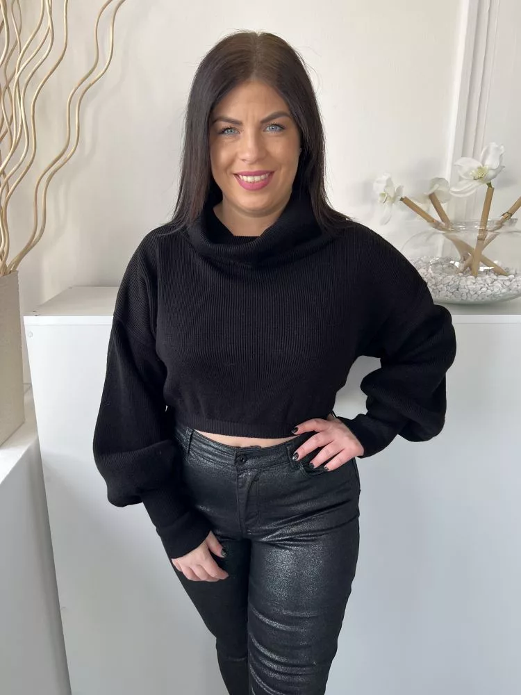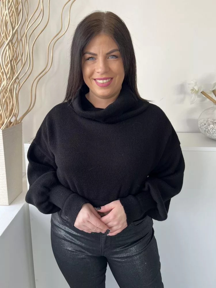 Missy Empire (M) Fekete Garbós Nyakú Rövid Derekú, Buggyos Ujjú, Kötött Felső