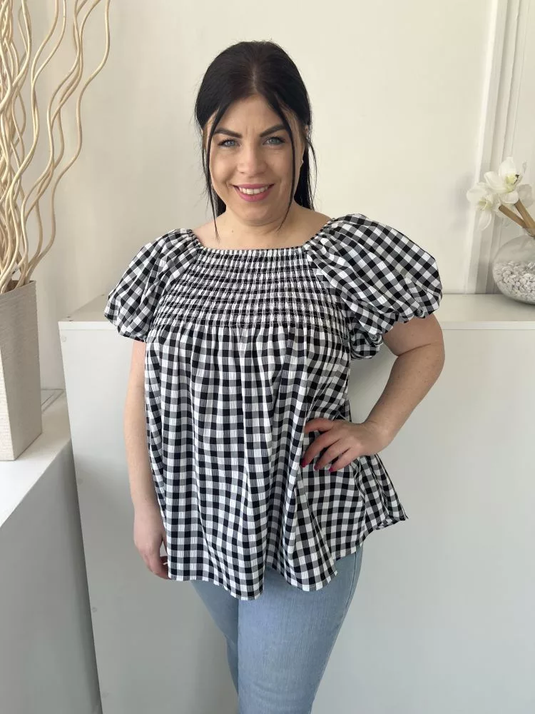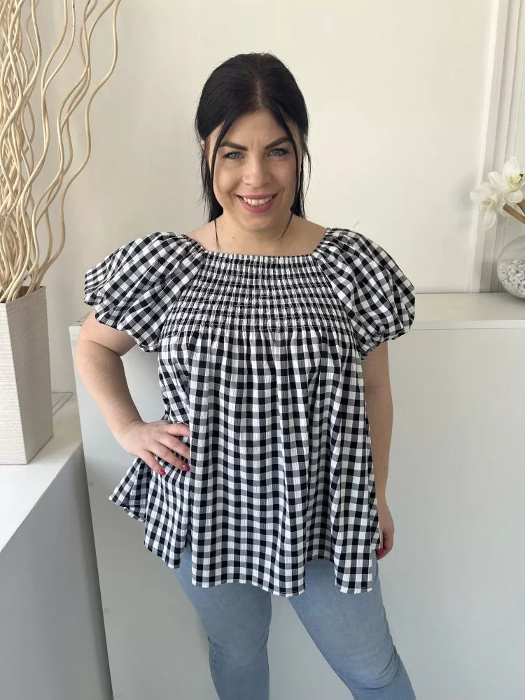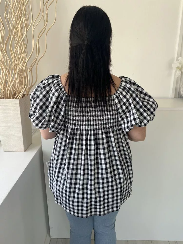 Mochy (M) Fekete-Fehér Kockás, Fell Darázsolt Buggyos Ujjú, Fodros Aljú Felső