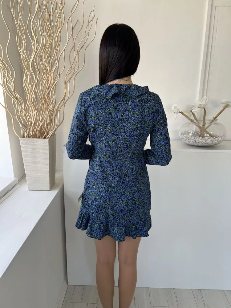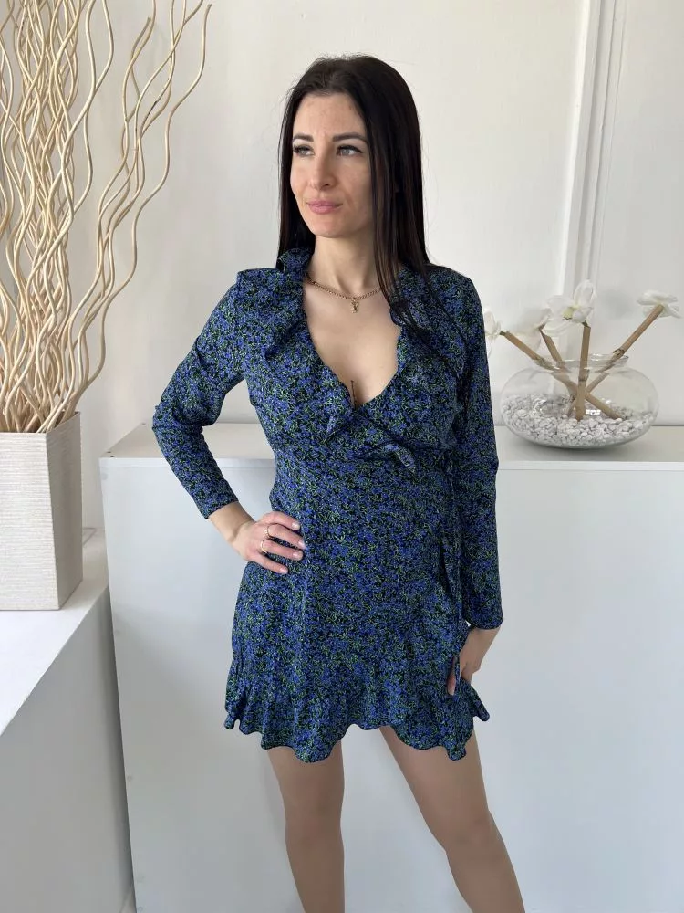 New Look (M) Fekete Kék Sűrű Virágos, Átlapolt Oldalt Megkötős, Fodros Szegélyű Ruha