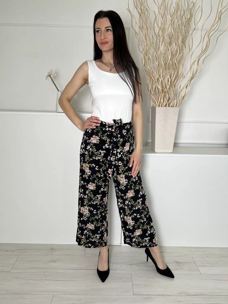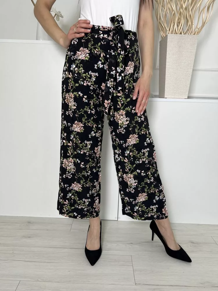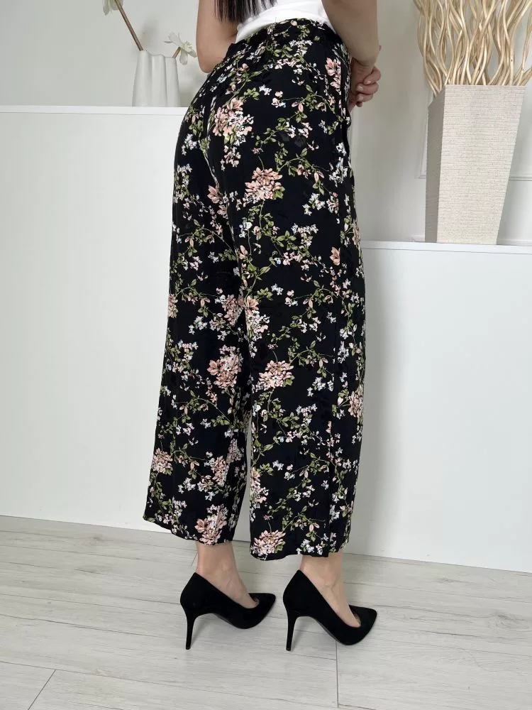 New Look (M) Fekete Színes Virágos, Hátul Gumisderekú Derékban Megkötős, Bőszárú Nadrág