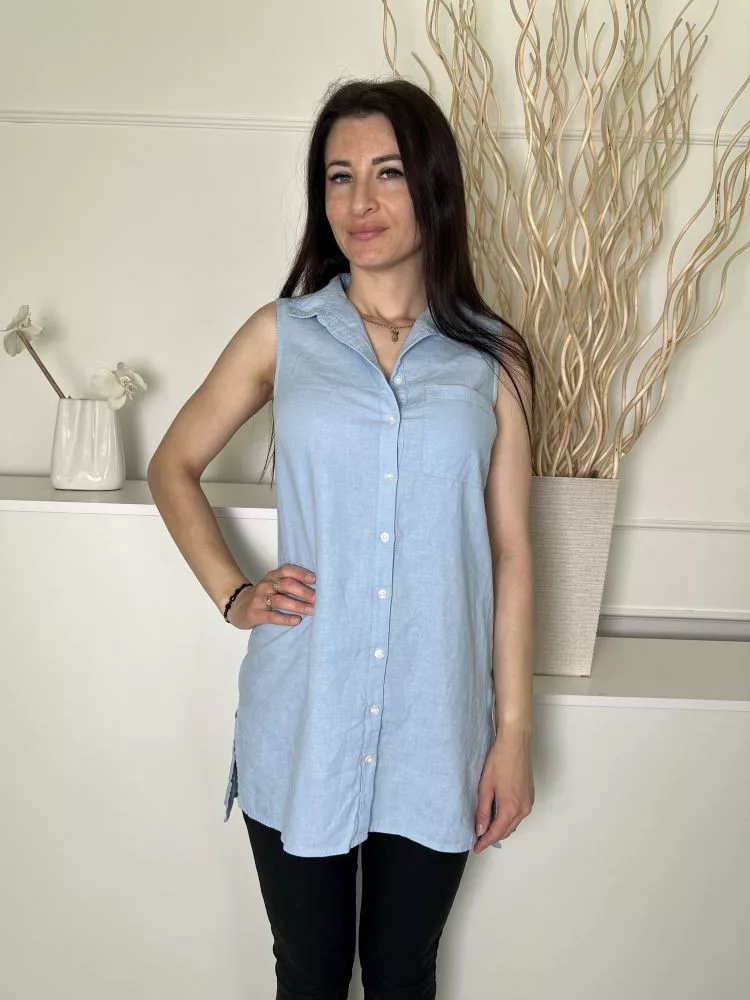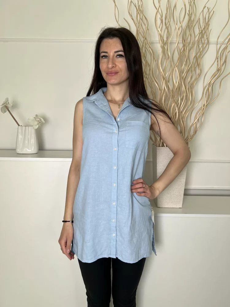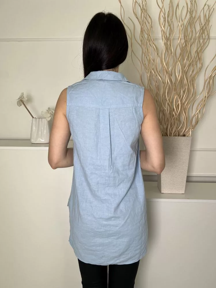 New Look (S) Világoskék Elől Végig Gombos, Mellnél Zsebes 55% Len Alapanyagú, Oldalt Sliccelt Felső