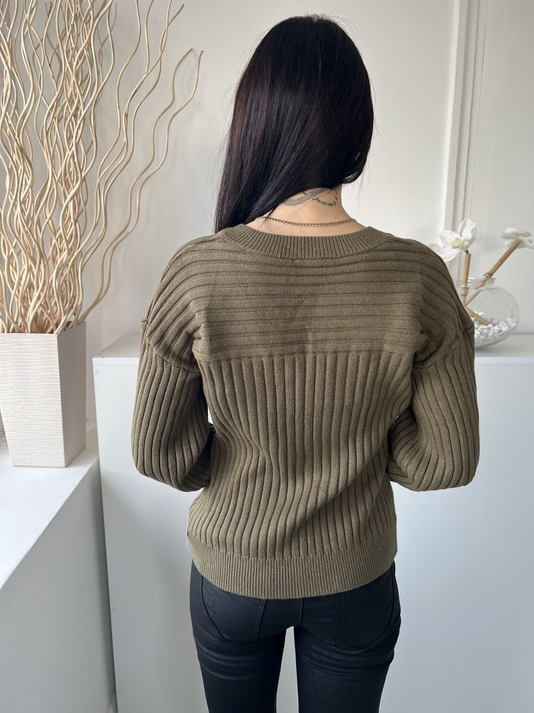 Next (M) Khaki Anyagában Bordázott V Kivágású, Kötött Felső
