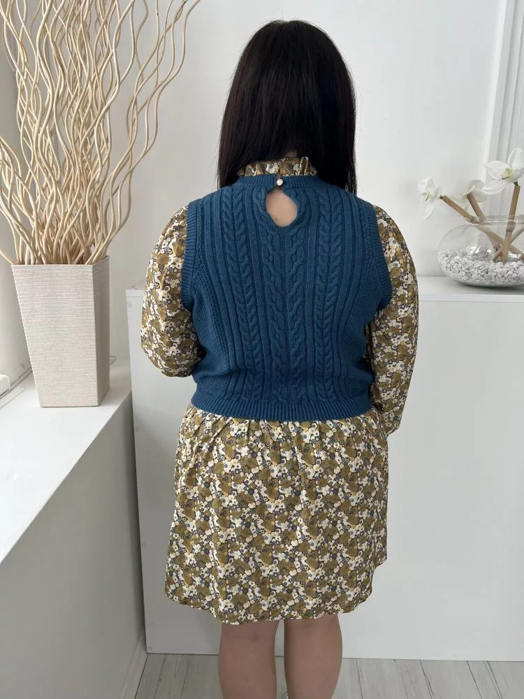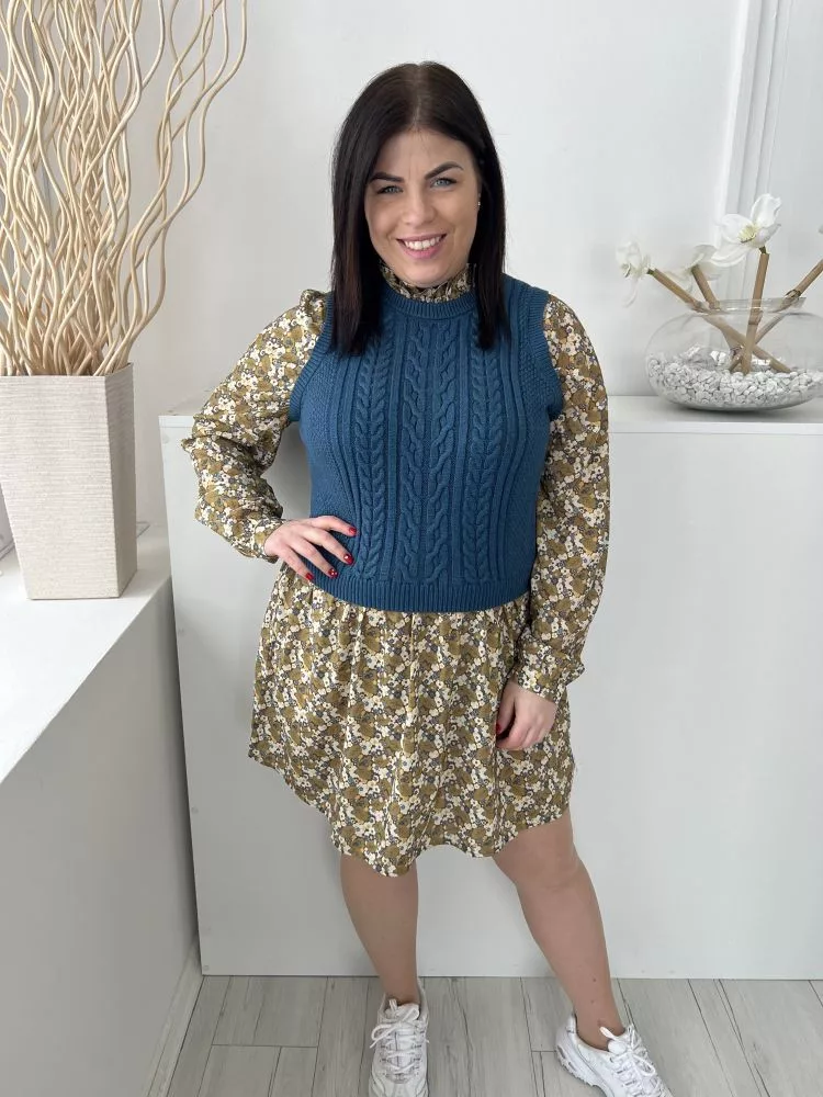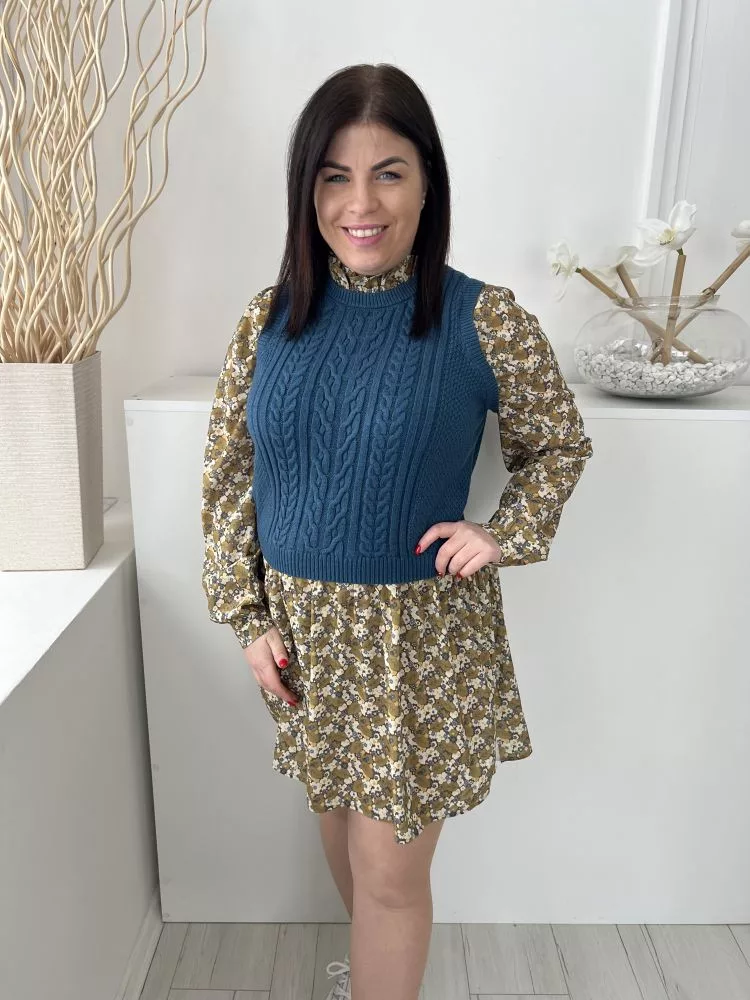 Next (M) Khaki-Kék Fehér Apró Virágos, Mellnél Kötött Betétes Hátul Nyakban Gombos Ruha