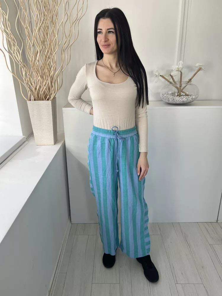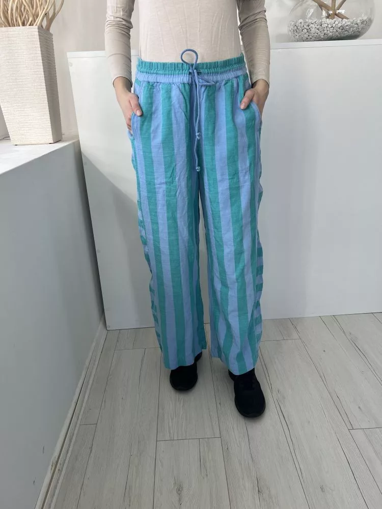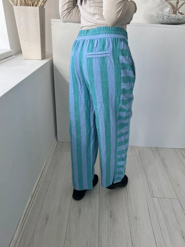 Next (M) Zöld Kék Csíkos, Derékban Összehúzható Megkötős, 87% Pamut Alapanyagú Nadrág