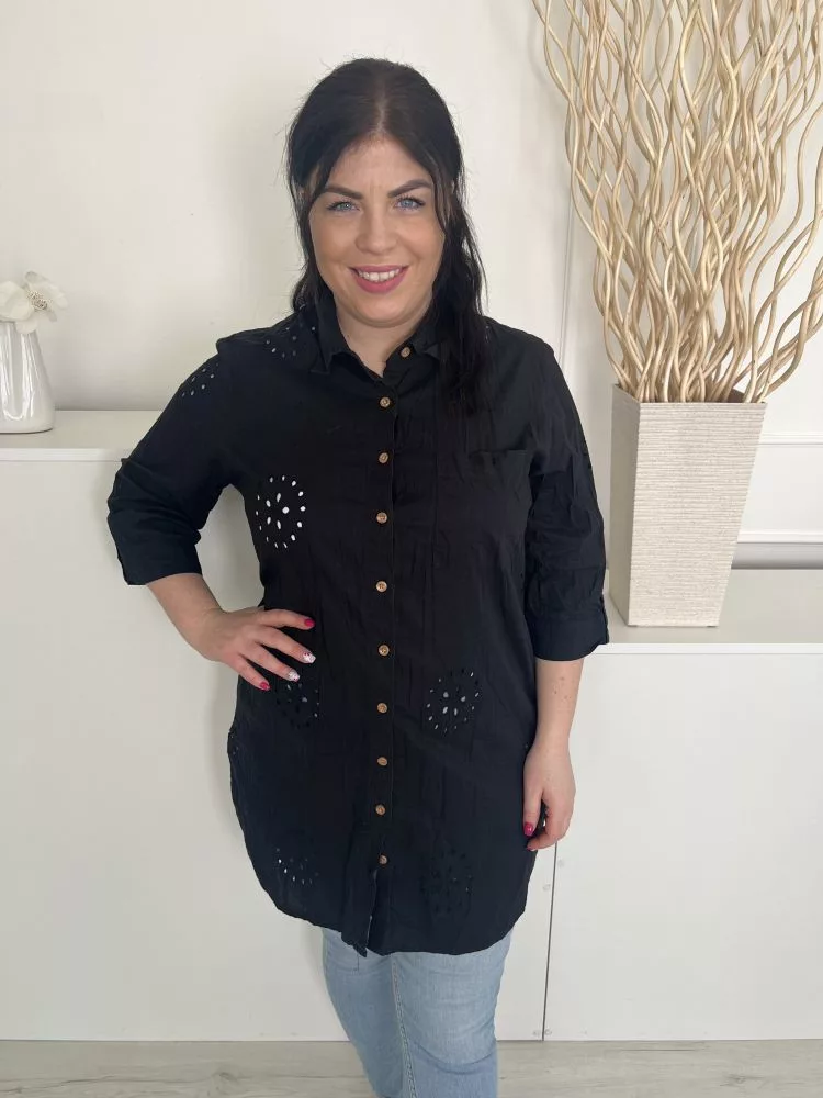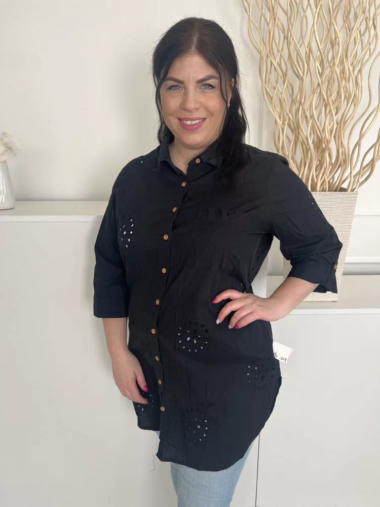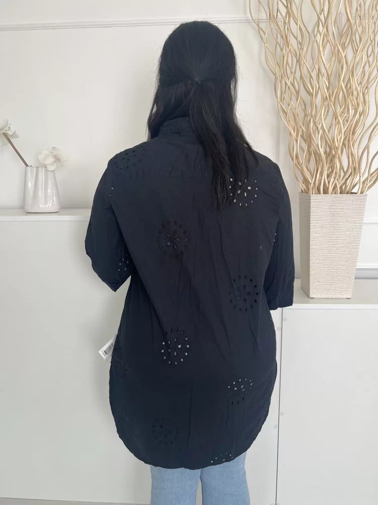 Papaya (L) Fekete Elől Végig Gombos, Mellnél Zsebes Lyukacsos Mintás, 100% Pamut Felső
