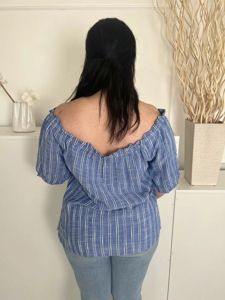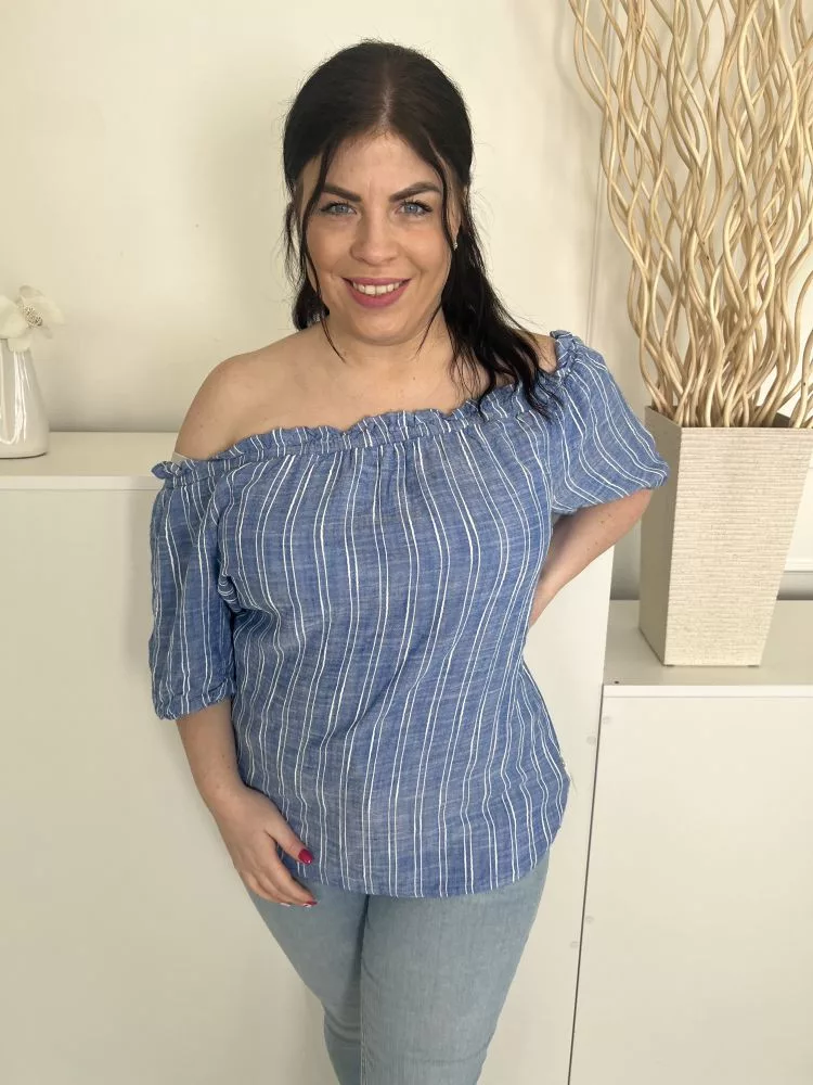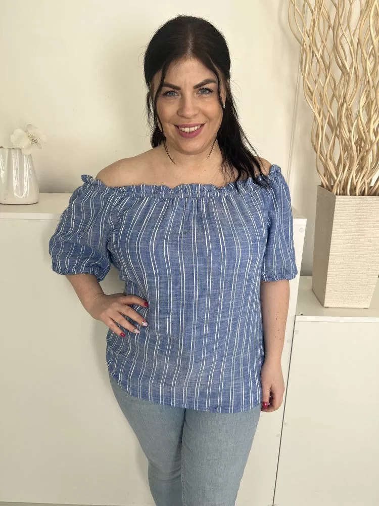 Papaya (L) Kék Fehér Csíkos, Ejtett Gumis Vállú Buggyos Ujjú Felső