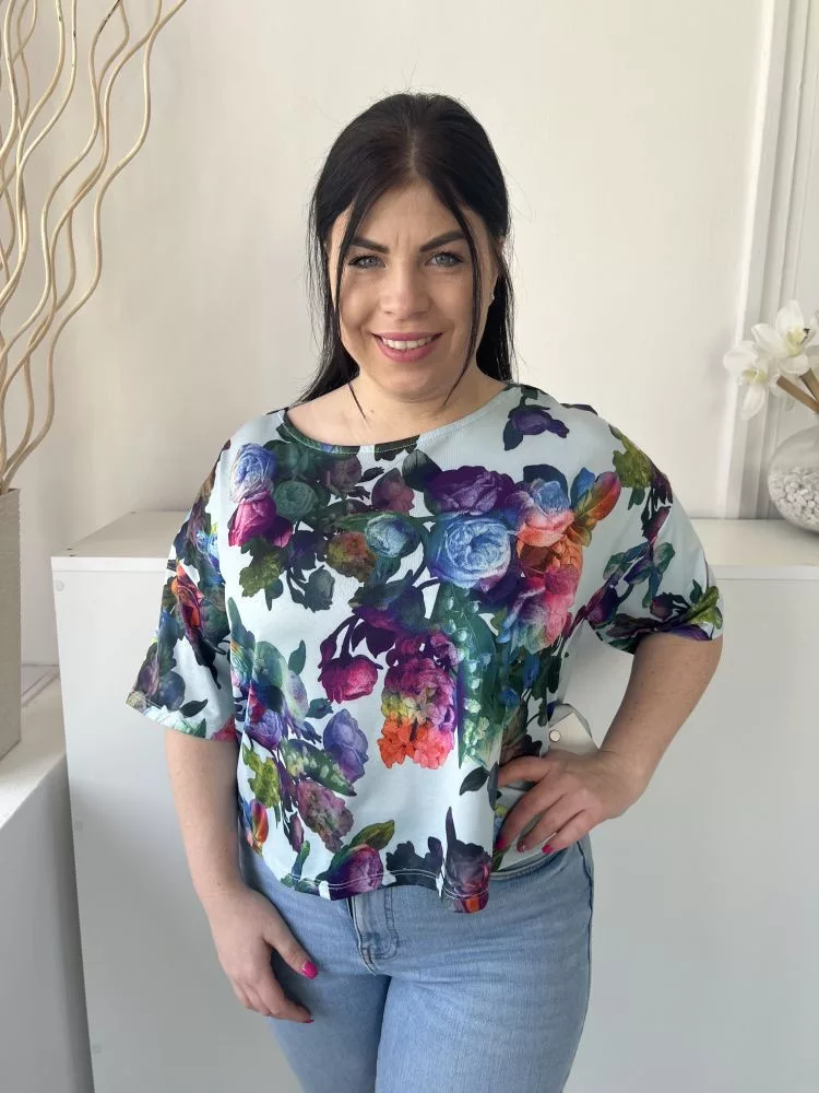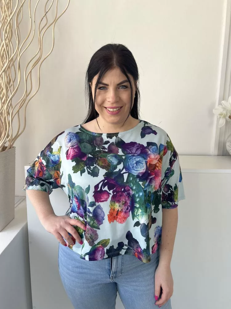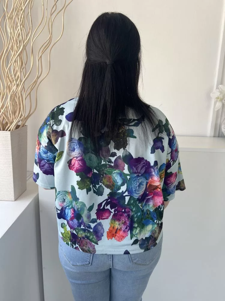 Papaya (M) Világoskék Színes Virágos, Csónak Nyakú Rövid Fazonú Felső