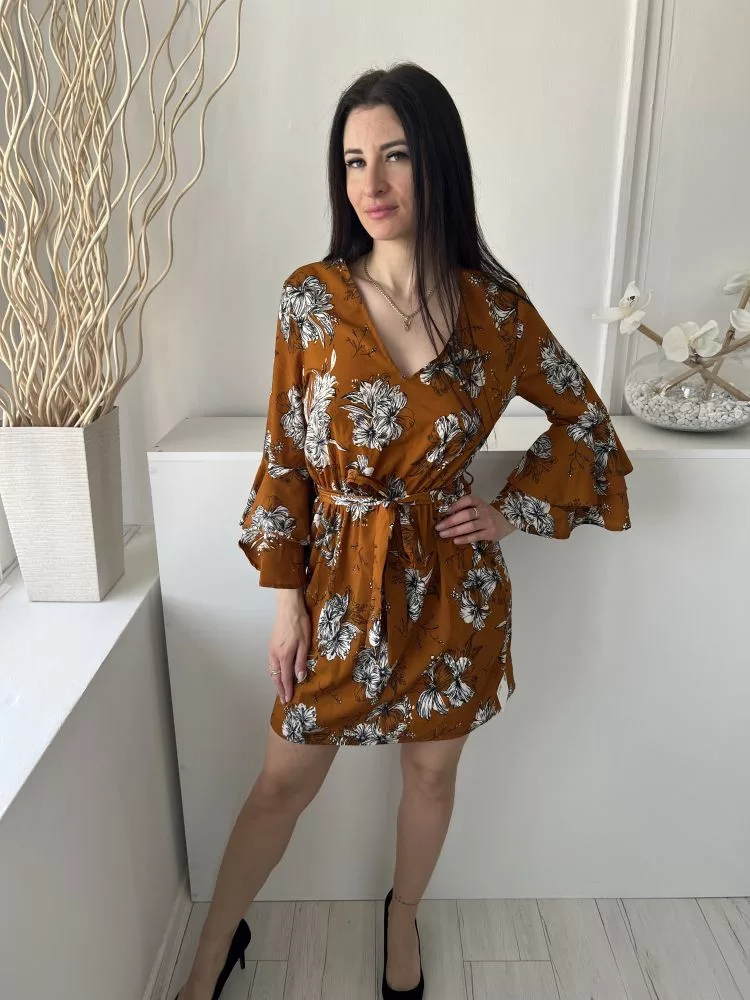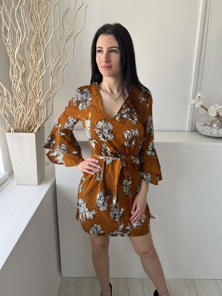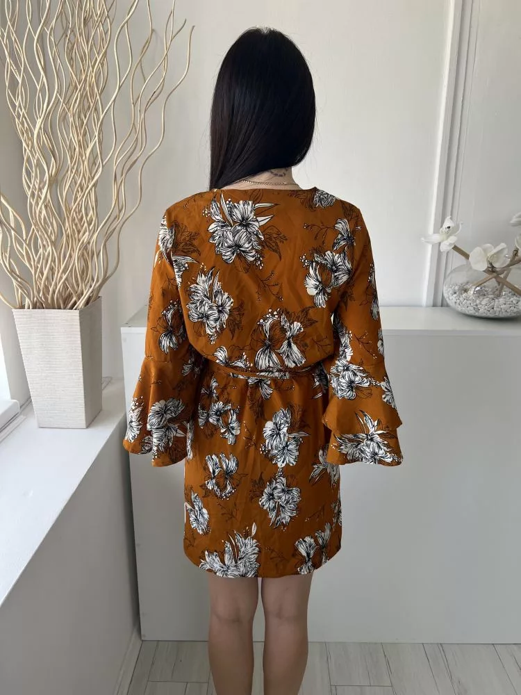 Parisian (M) Bronzbarna Fehér Virágos, V Kivágású Gumisderekú, Megkötős, Tölcsér Ujjú Ruha