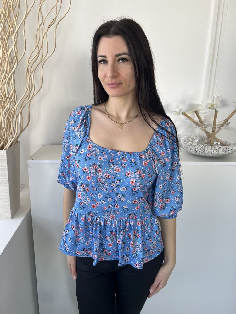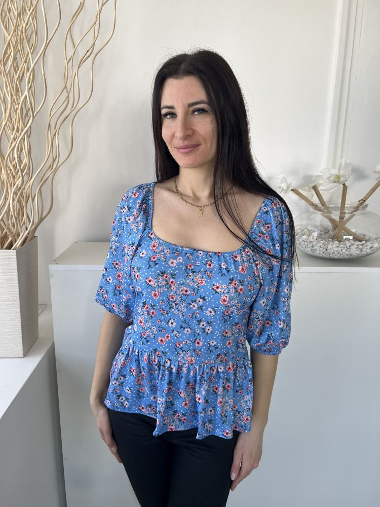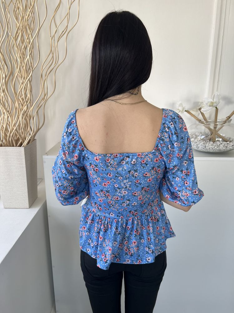 Peacocks (M) Kék Apró Virágos, Kocka Kivágású Fodros Aljú, Buggyos Ujjú Felső