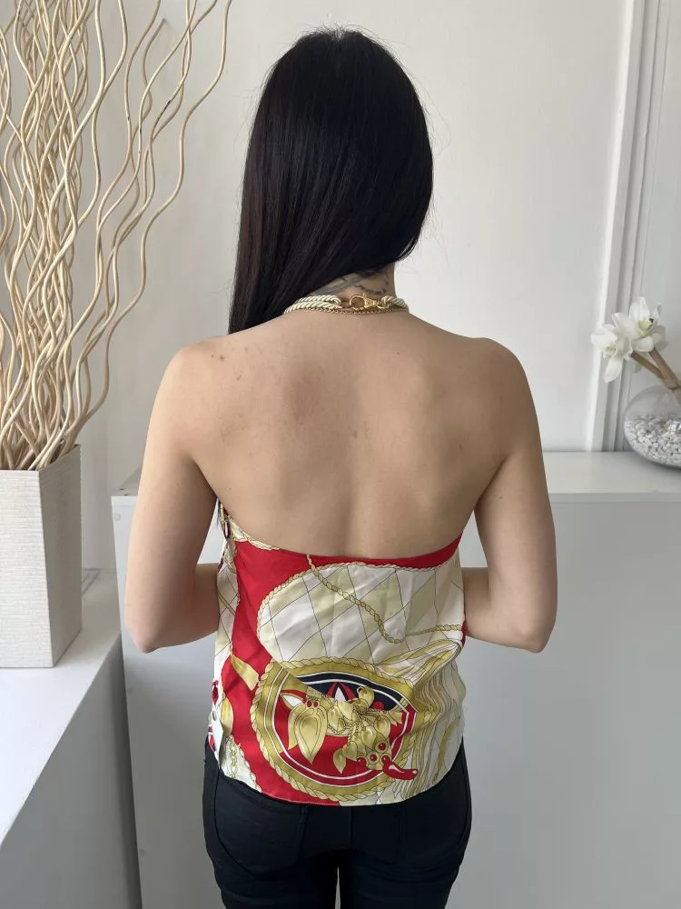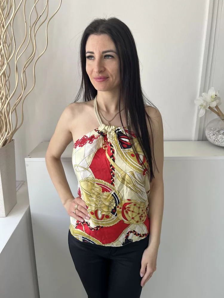 Pink Tartan (S) Fehér-Piros-Sárga Oldalt Cipzáros, Mintás Hátul Nyakban Kapcsos Felső