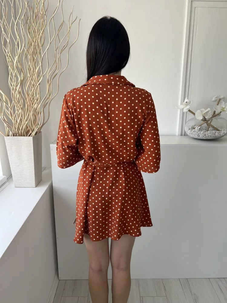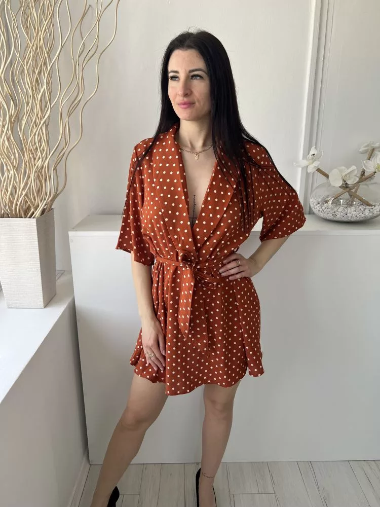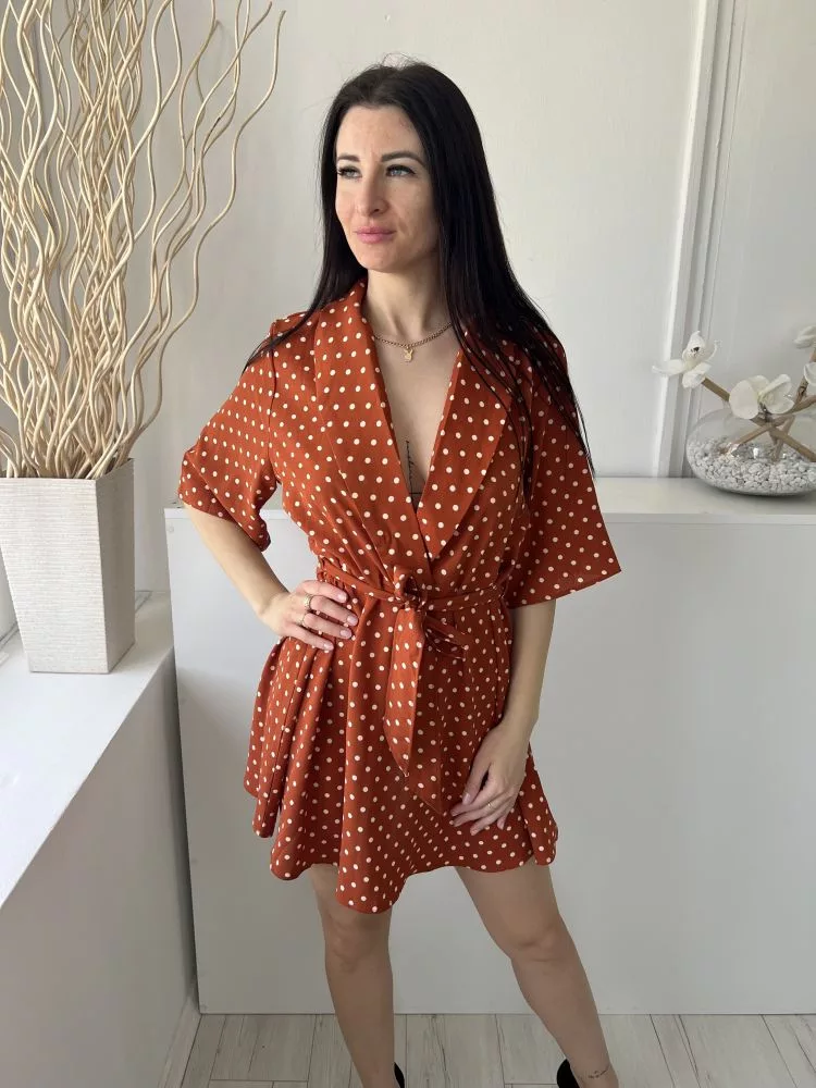 Pretty Little Thing (M) Barna Fehér Pöttyös, Galléros Derékban Megkötős Ruha