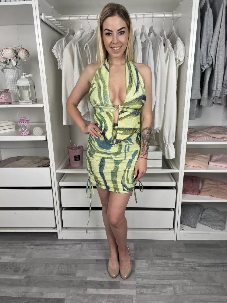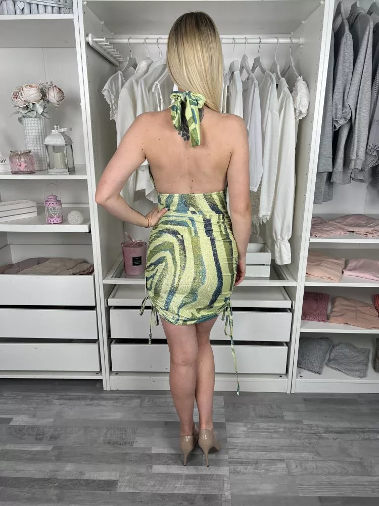 Pretty Little Things (M) Selyemcukor Zöld Mintás, Anyagában Csillogós Elől Mélykivágású, Díszkarikás, Oldalt Összehúzható Ruha