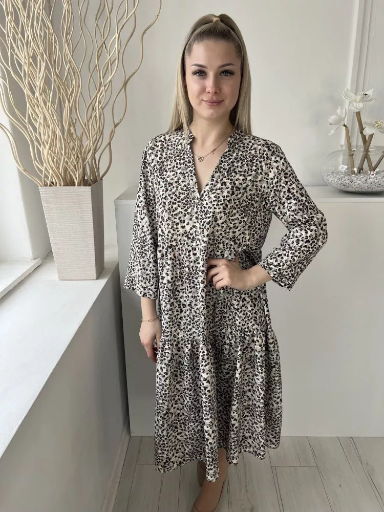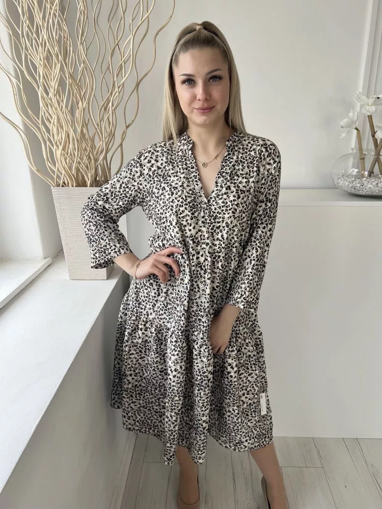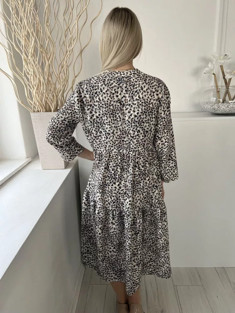 Primark (M) Drapp-Szürke Fekete Foltmintás, V Kivágású Fodros Aljú, Bőfazonú Ruha