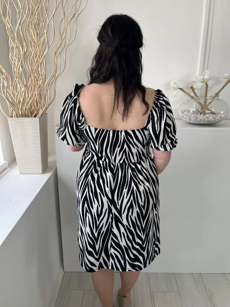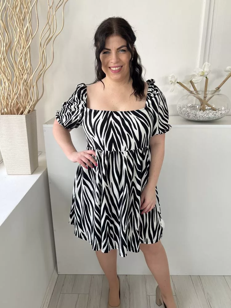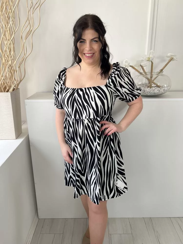 Primark (M) Fehér Fekete Zebracsíkos, Kocka Kivágású Gumisderekú, Buggyos Ujjú Ruha
