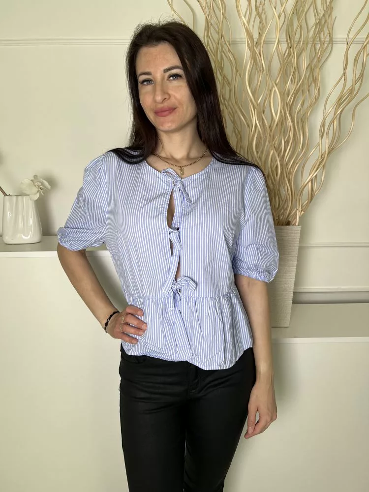 Primark (M) Kék Fehér Csíkos, Elől Végig Megkötős Gumis Ujjvégű, Fodros Aljú, 100% Pamut Felső