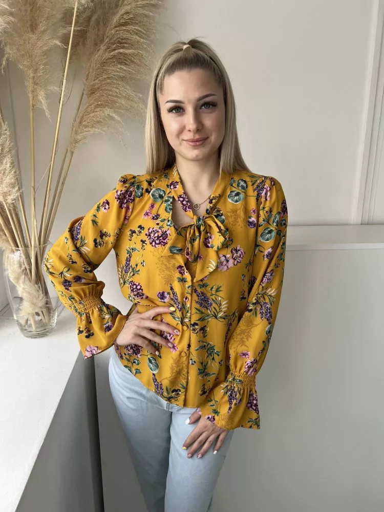 Primark (S) Okkersárga Színes Virágos, Elől Végig Gombos Nyakban Megköthető, Tölcsér Ujjú Felső