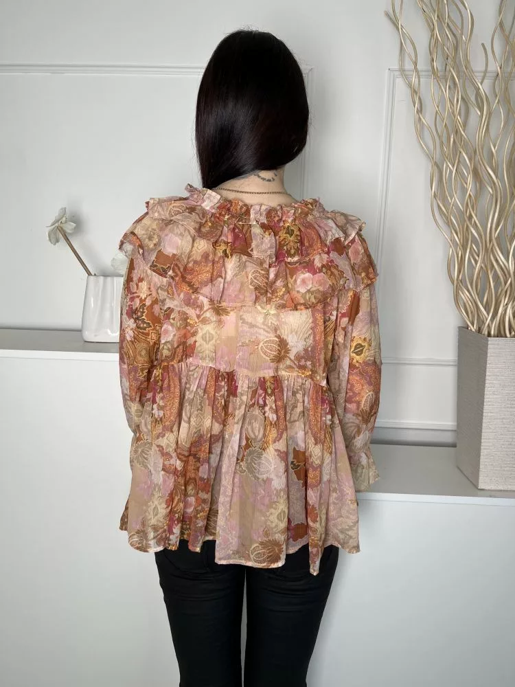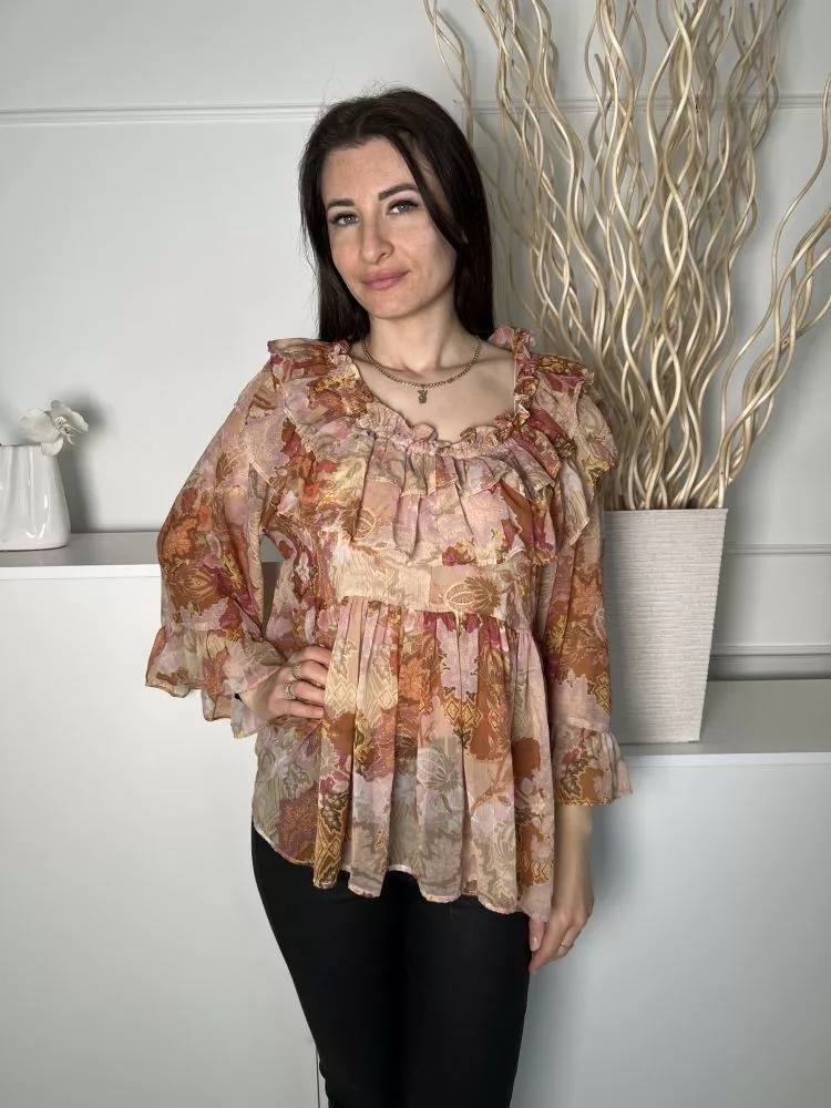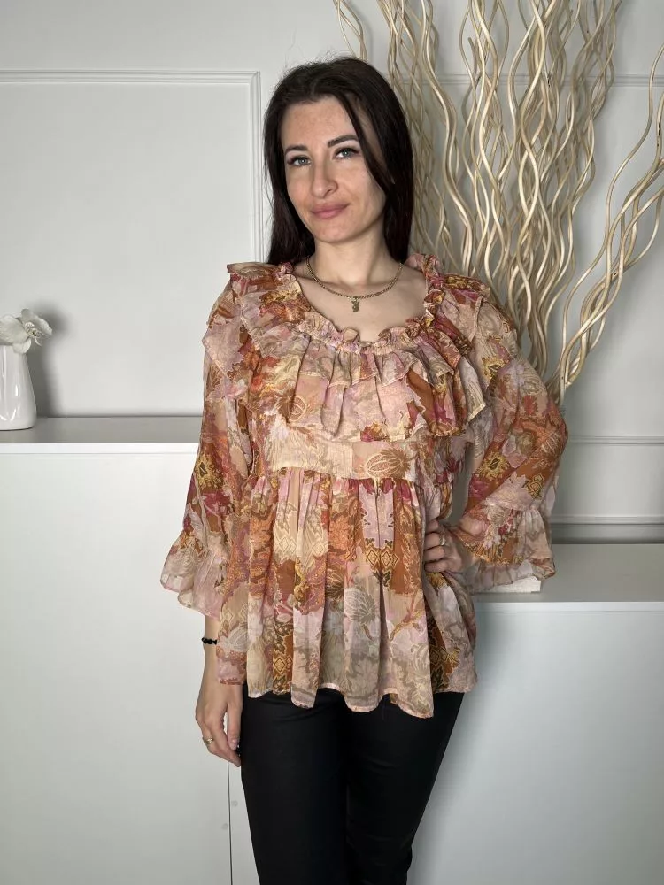 River Island (S) Barna-Drapp Mintás, Fodros Szegélyes Enyhén Áttetsző, Tölcsér Ujjú Felső