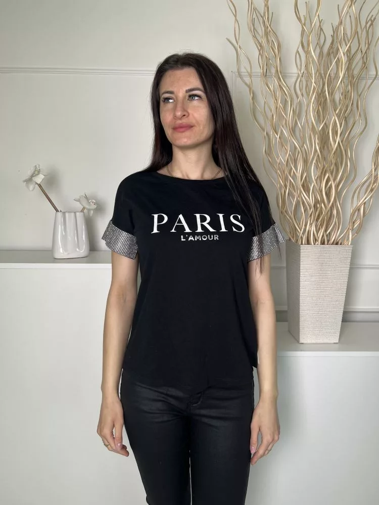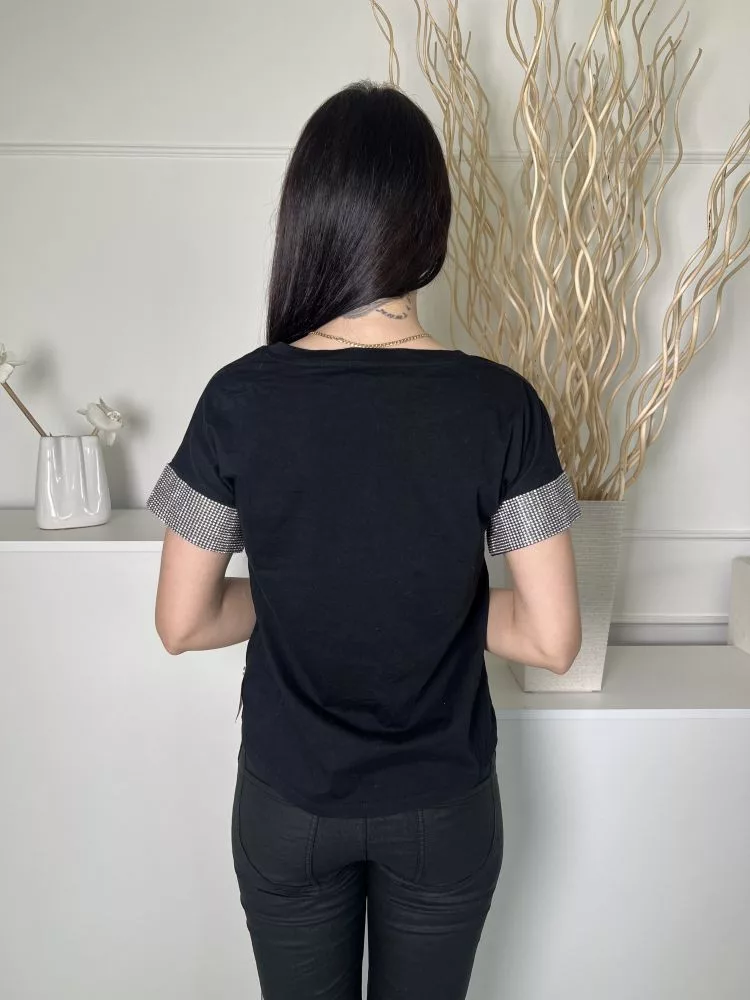 River Island (S) Fekete Elől Feliratos, Ujján Díszköves Kerek Nyakú, 100% Pamut Alapanyagú Felső