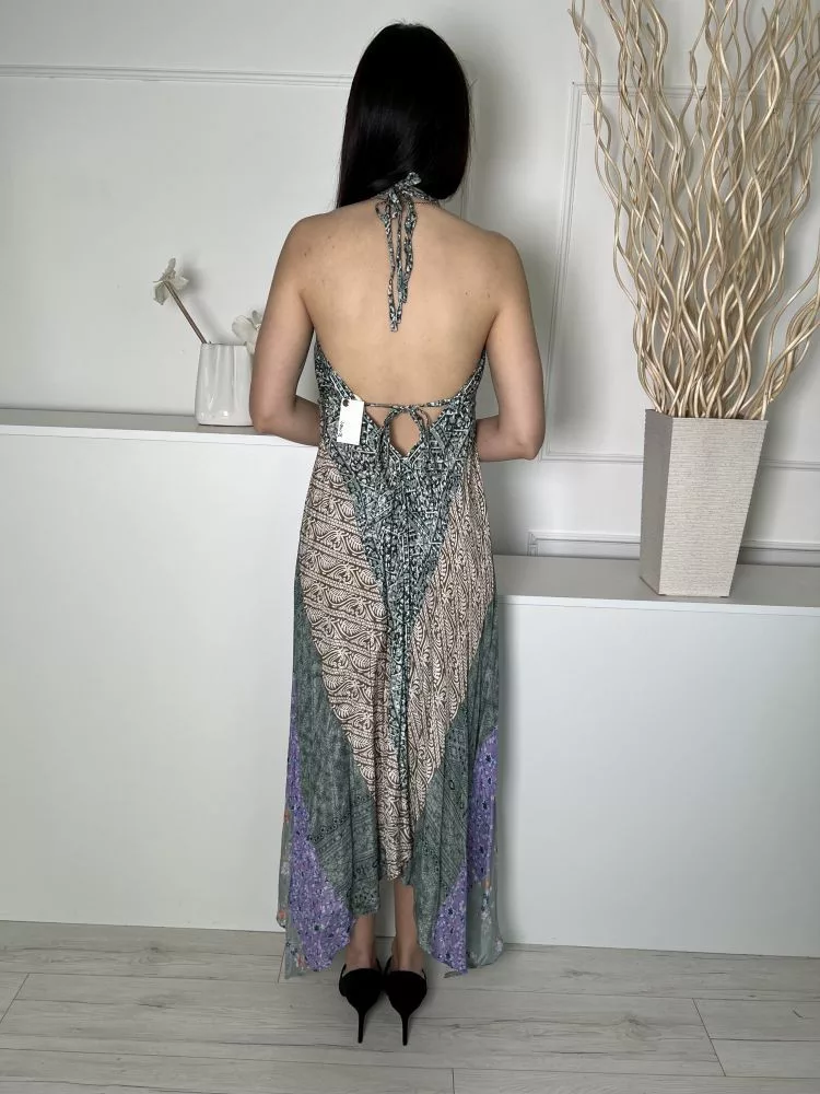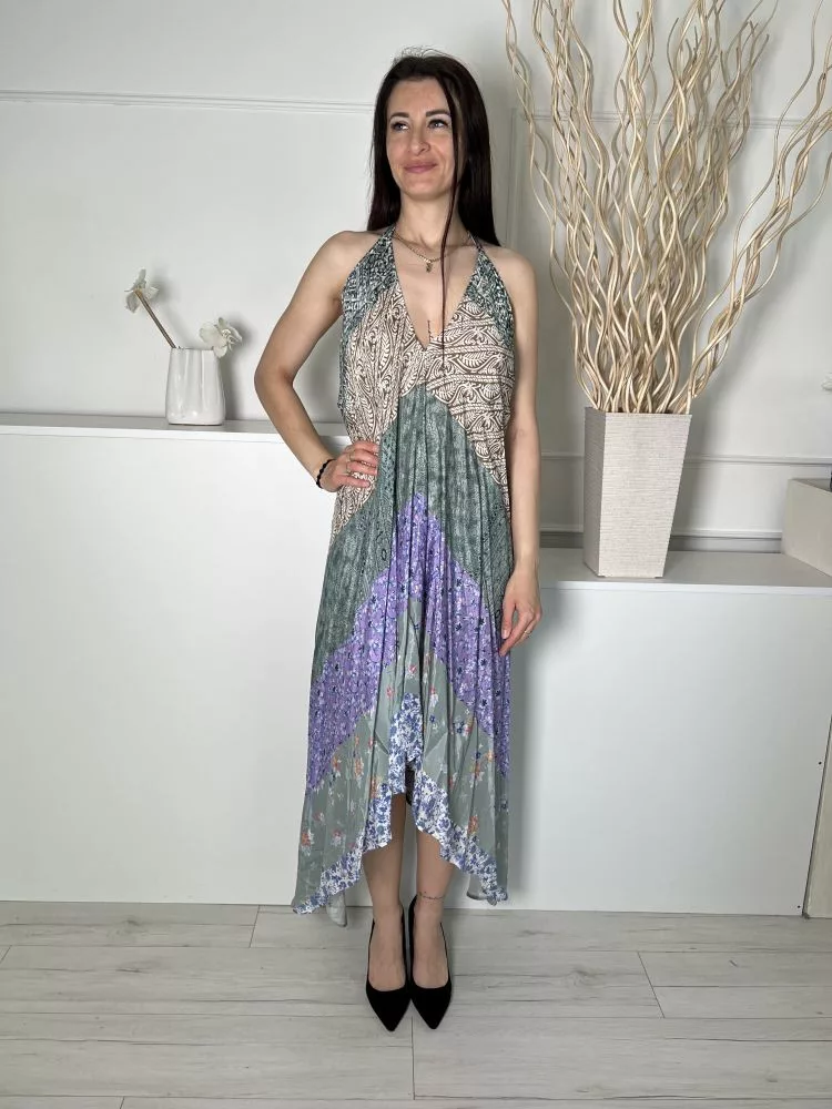 River Island (S) Zöld-Lila-Barna Színes Mintás, Hátul Nyakban Megkötős Hátul Nyitott, Lenge Fazonú Ruha