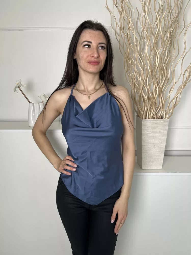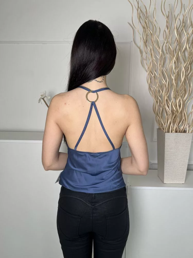 River Island (XS) Borongóskék Elől Ejtett Nyakú Hátul Díszkarikás, Fényes Anyagú Felső