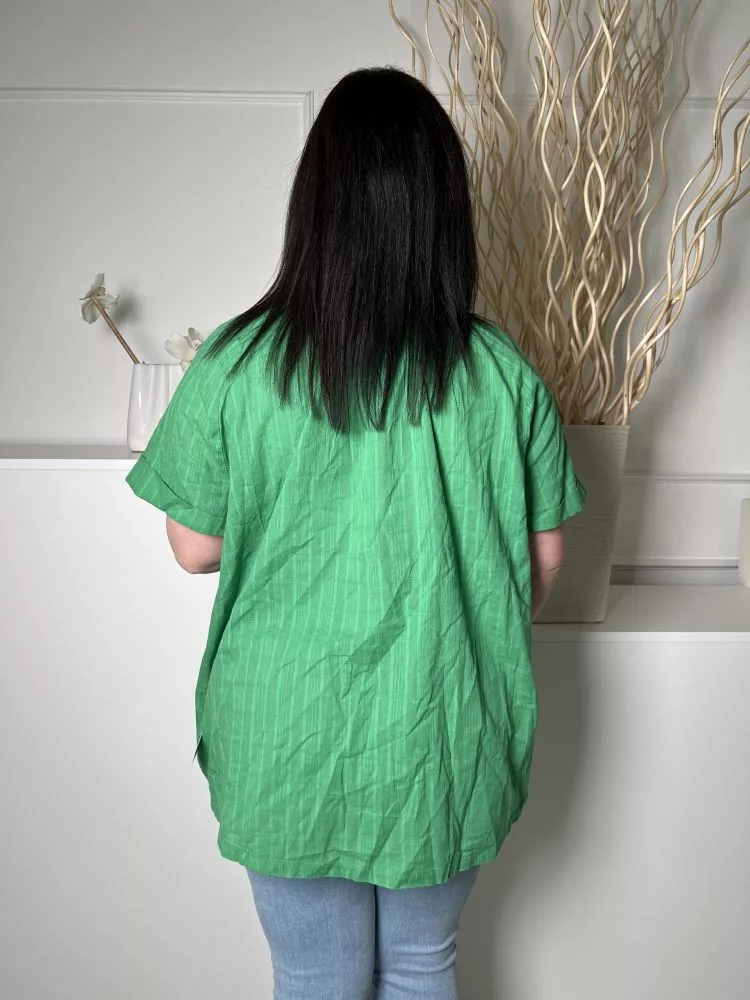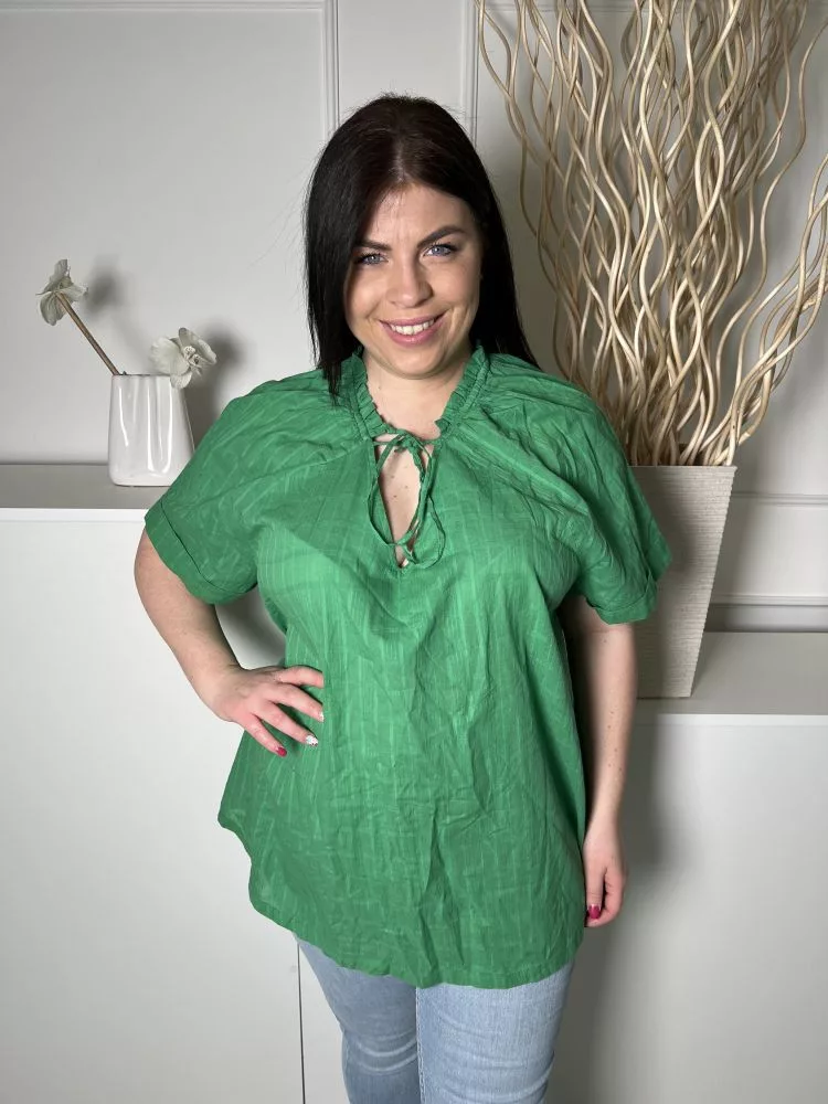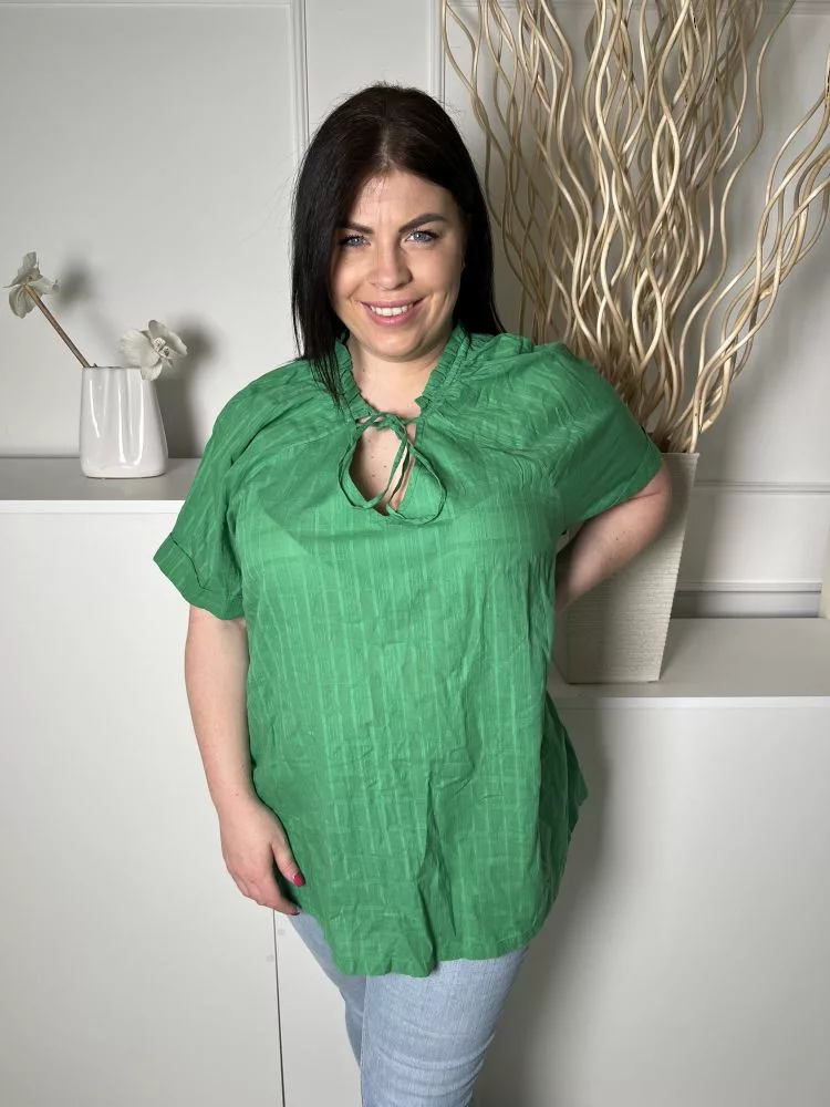 Roman (XXL) Fűzöld Anyagában Mintás, Nyakban Megköthető Felvarrt Ujjvégű, 100% Pamut Felső