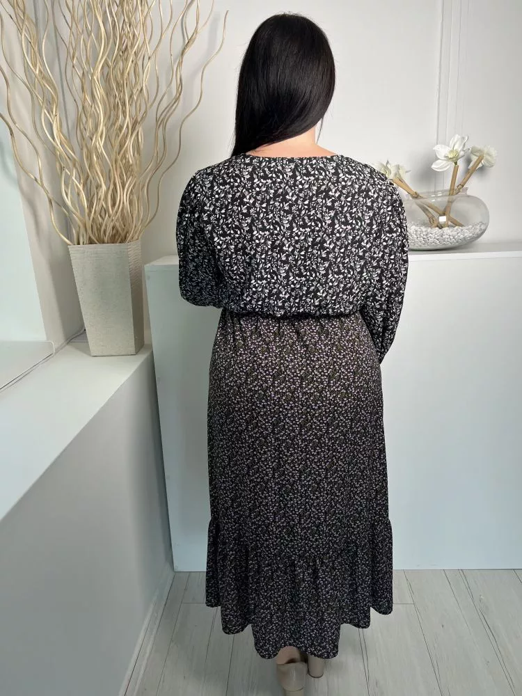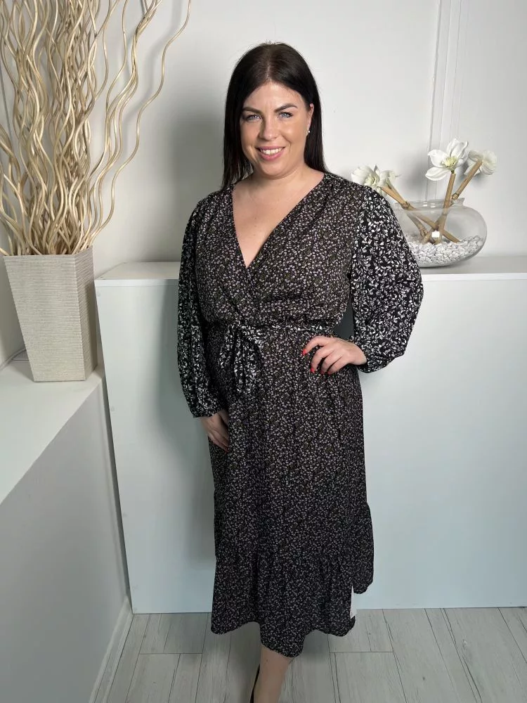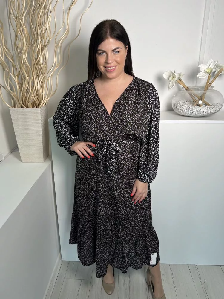Rowen Avenue (L) Fekete Sűrű Apró Virágos, Mellnél Átlapolt Gumisderekú, Megkötős Ruha