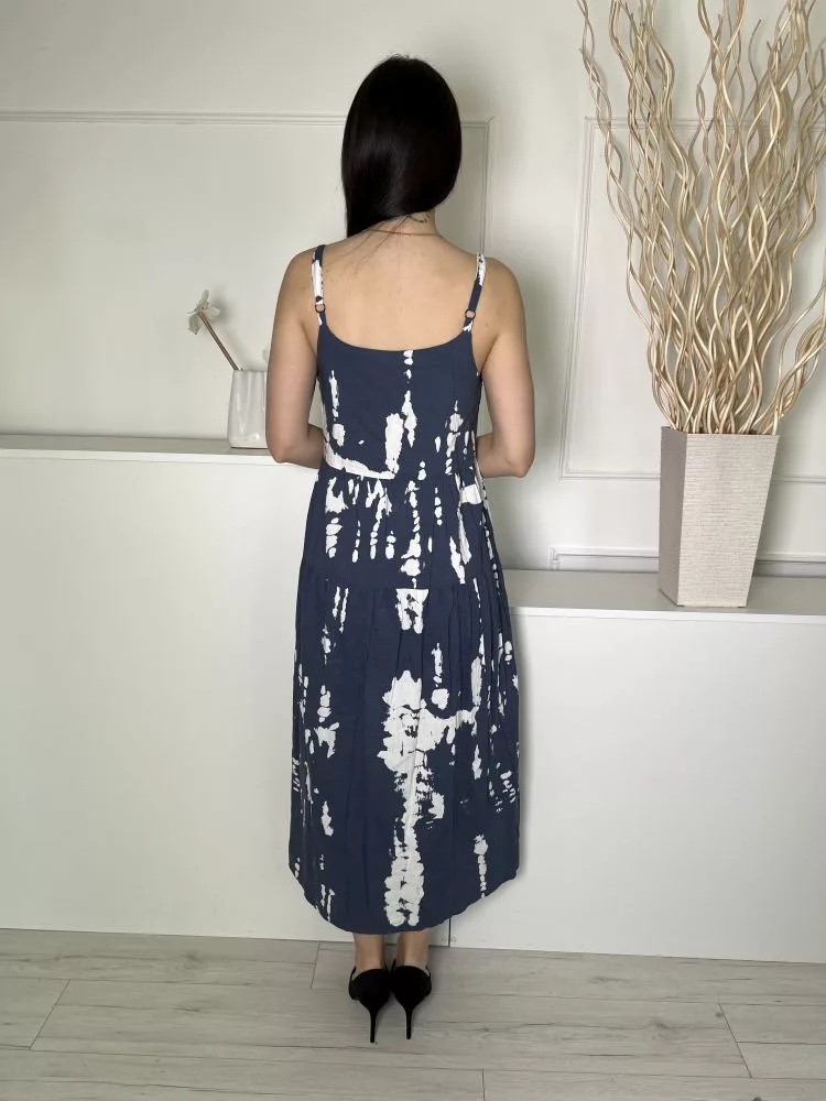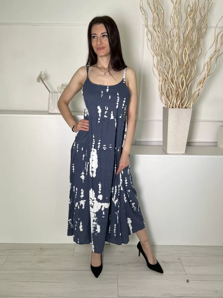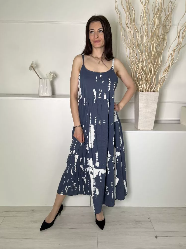 (S) Borongóskék Fehér Mintás, 100% Pamut Zsebes, Pántos Ruha