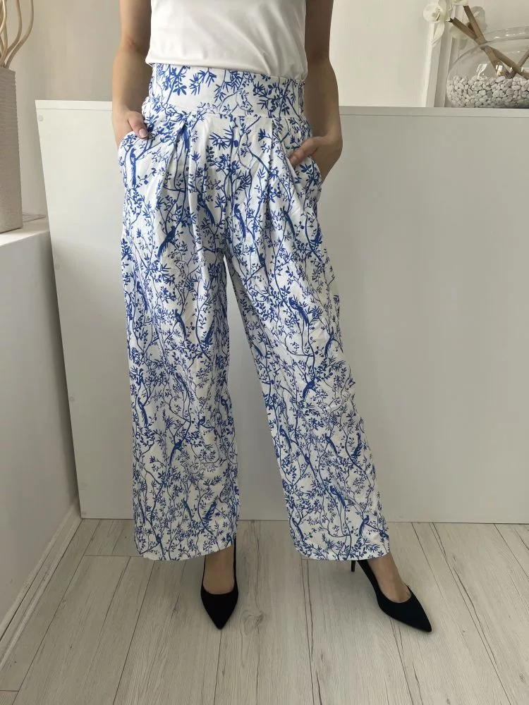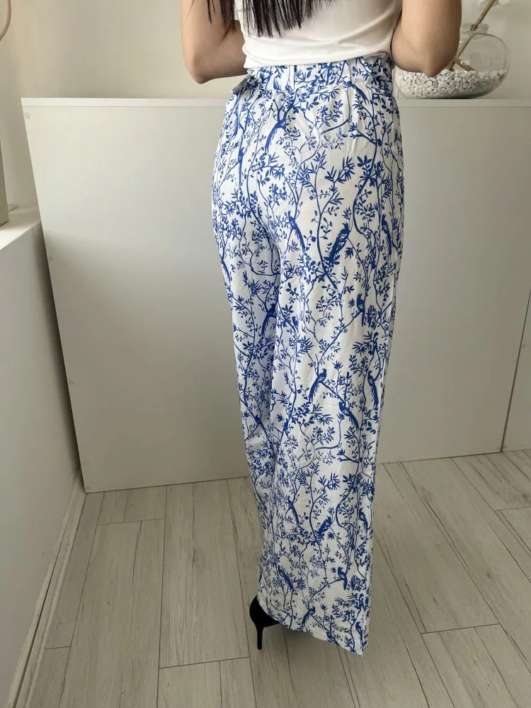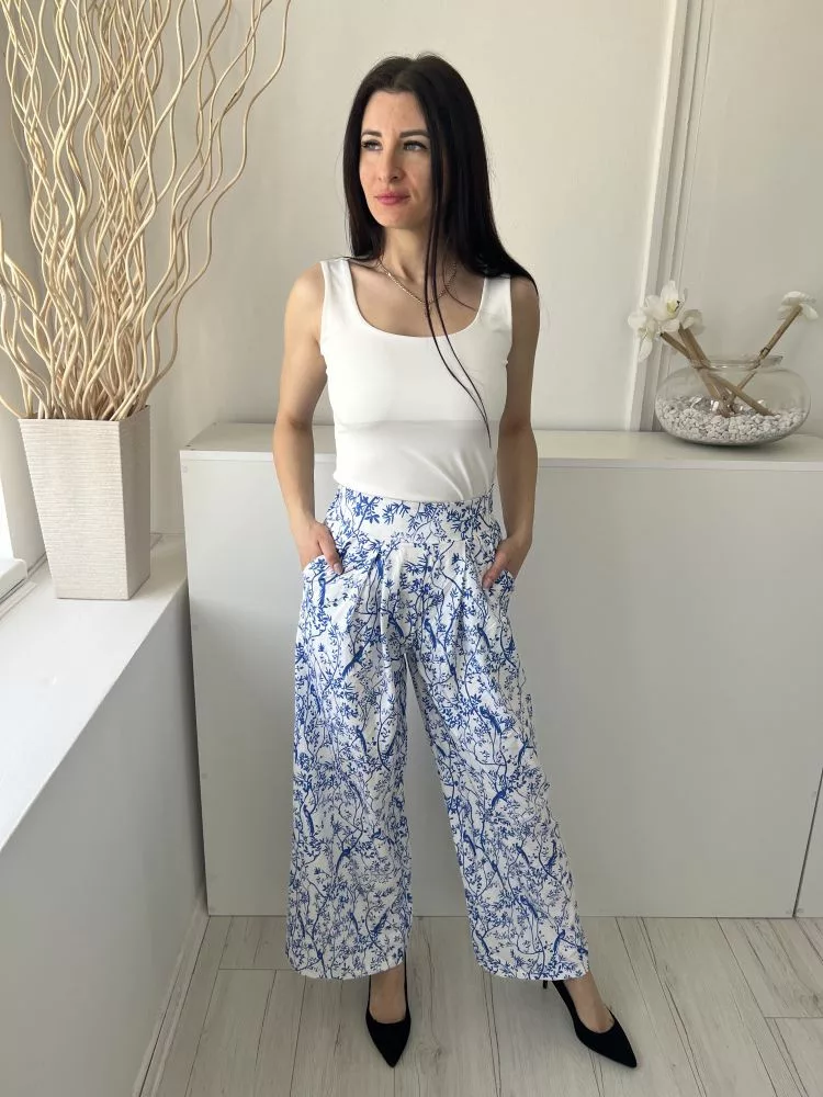 (S) Fehér Kék Virágmintás, Oldalt Cipzáros Zsebes, Bőszárú Nadrág