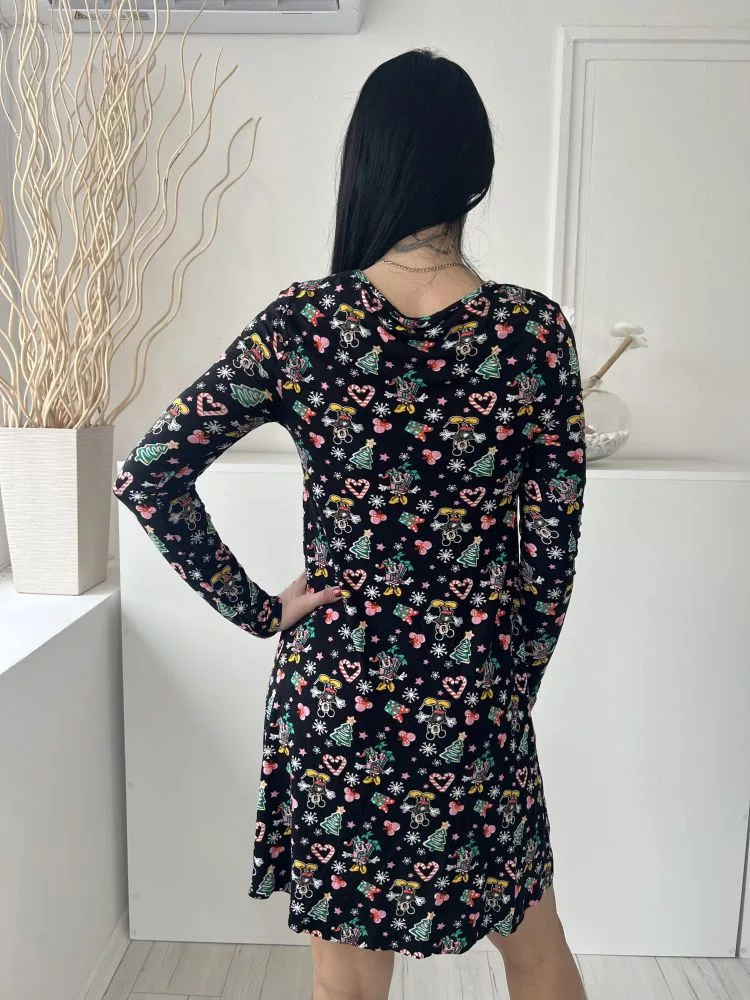 (S) Fekete Apró Karácsonyi Mintás Vékony Anyagú, Kereknyakú Ruha