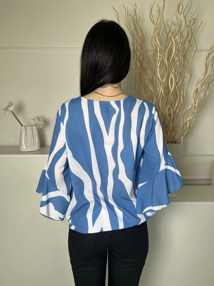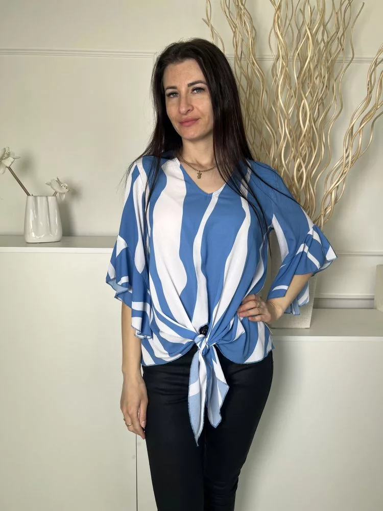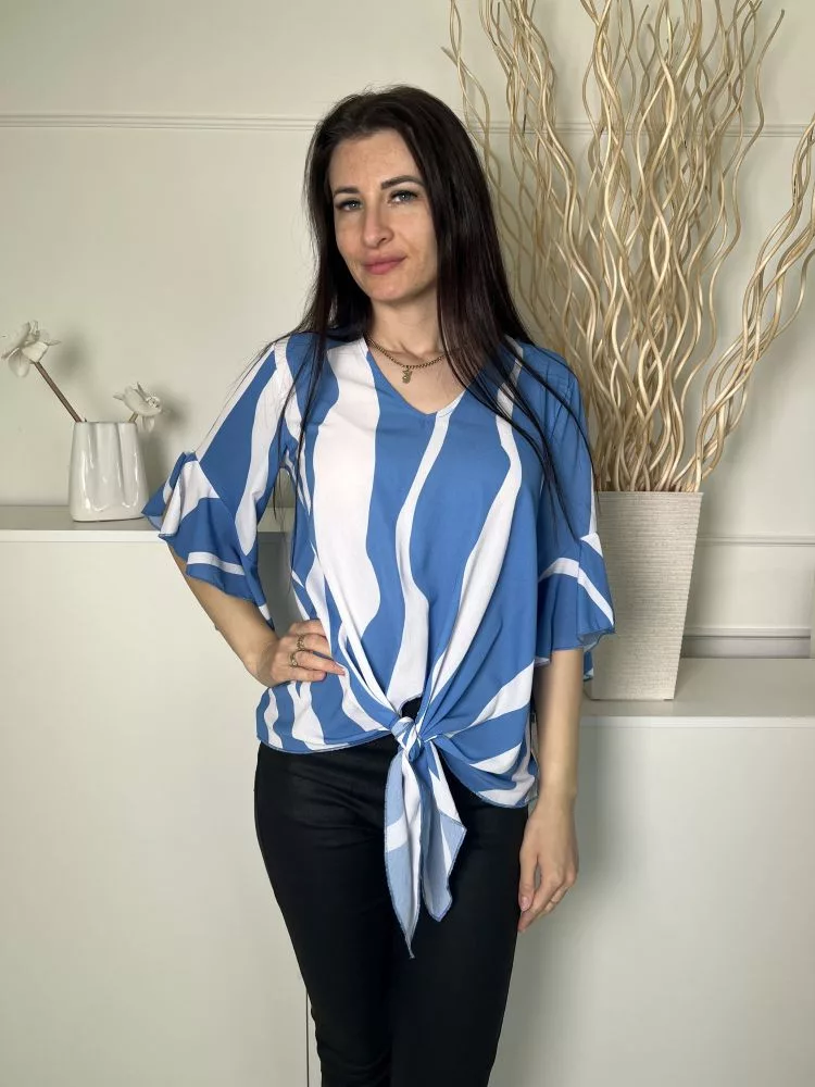(S) Kék Fehér Csíkos, Alul Megkötős Fodros Ujjvégű, V Kivágású Felső