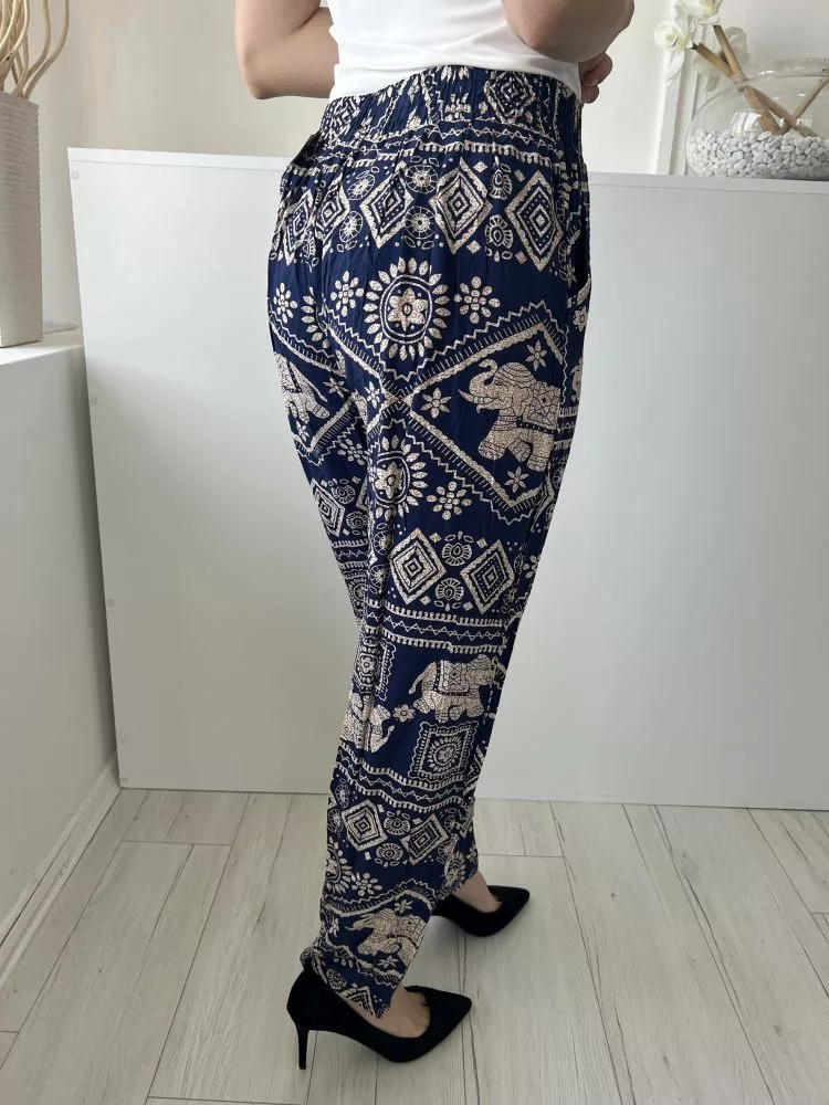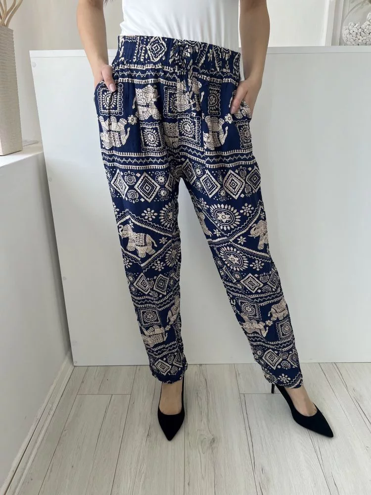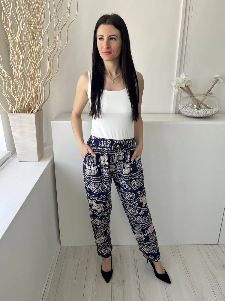 (S) Sötétkék Drapp Mintás, Gumisderekú Díszmegkötős, Zsebes, 100% Pamut Nadrág
