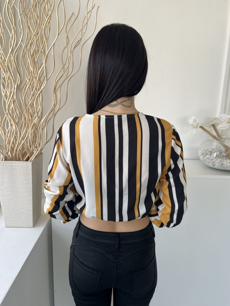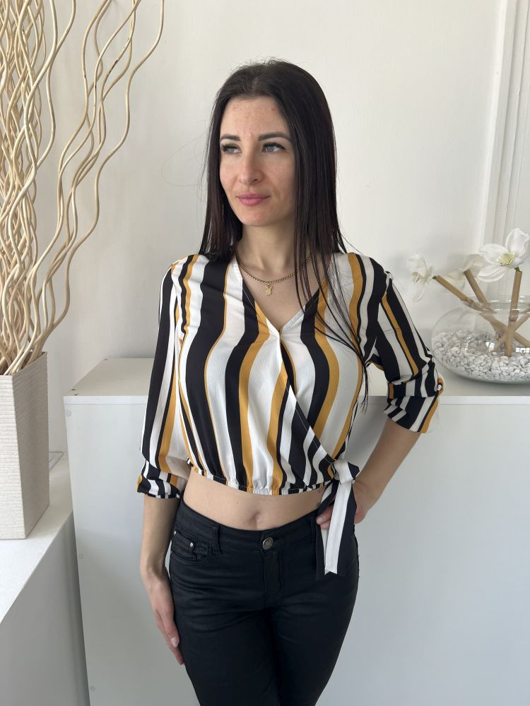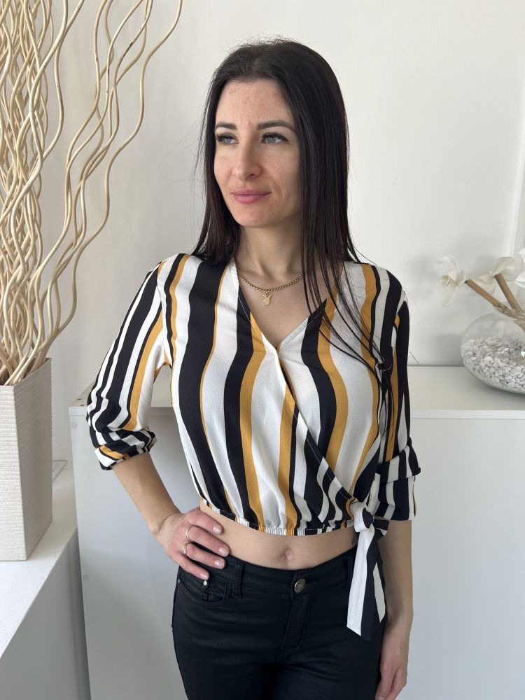 Select (M) Fehér-Sárga-Fekete Mellnél Díszlapolású, Oldalt Megkötős Gumisderekú, Gumis Ujjvégű Felső