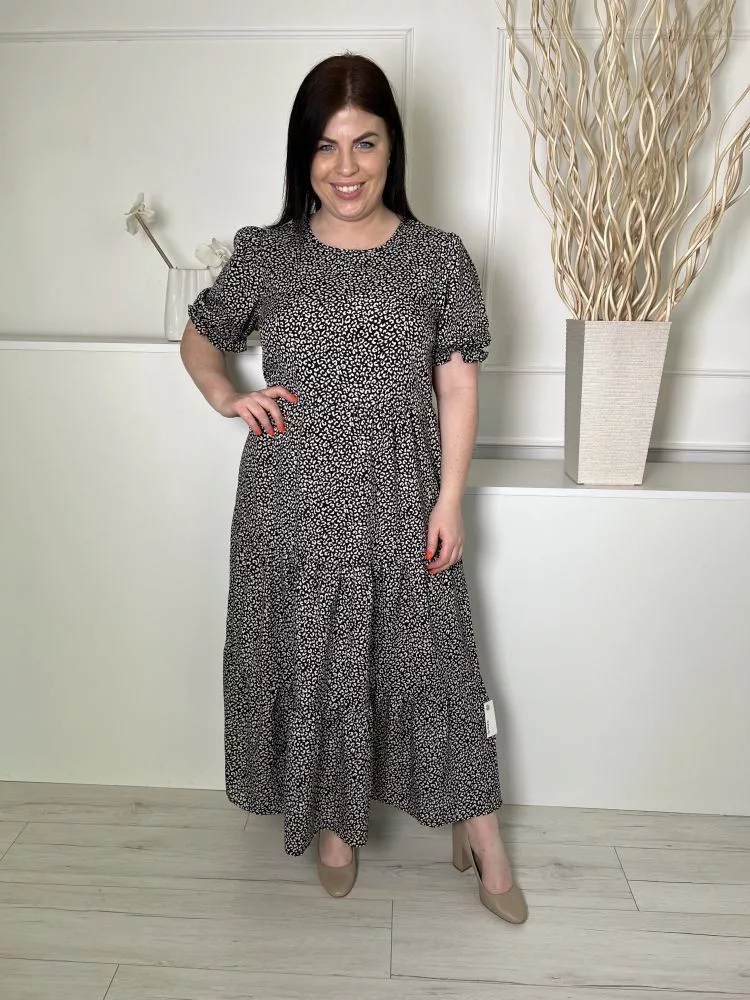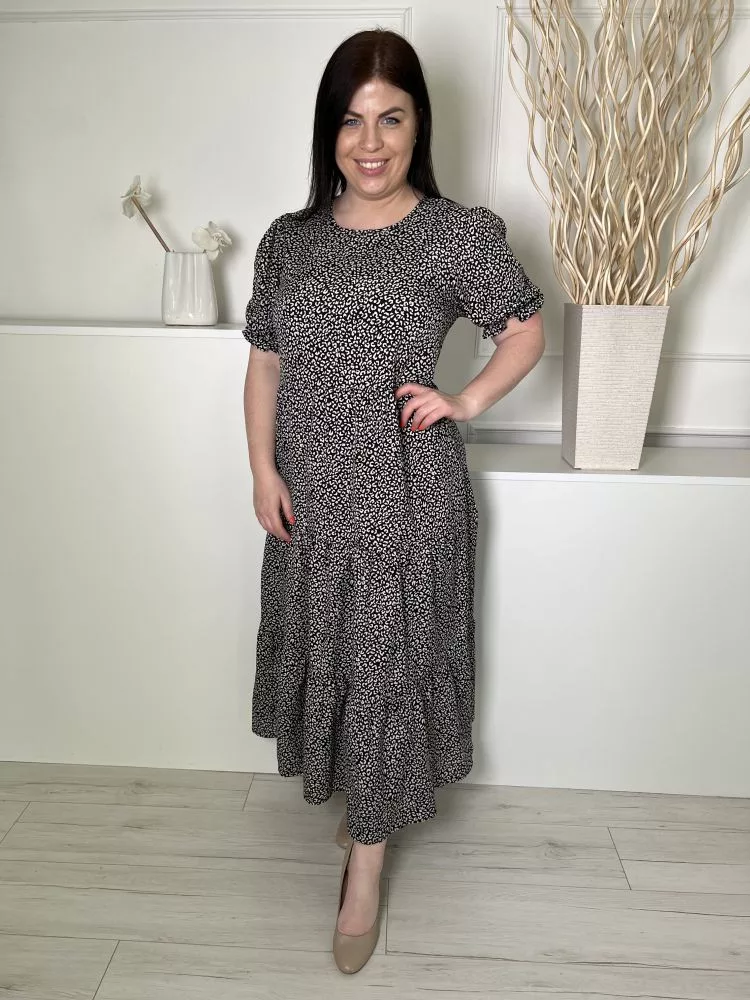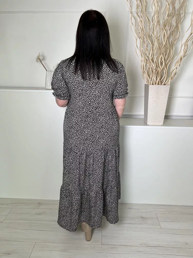 Shein (L) Fekete Drapp Foltmintás, Hátul Nyakban Gombos Fodros Ujjvégű és Aljú Ruha