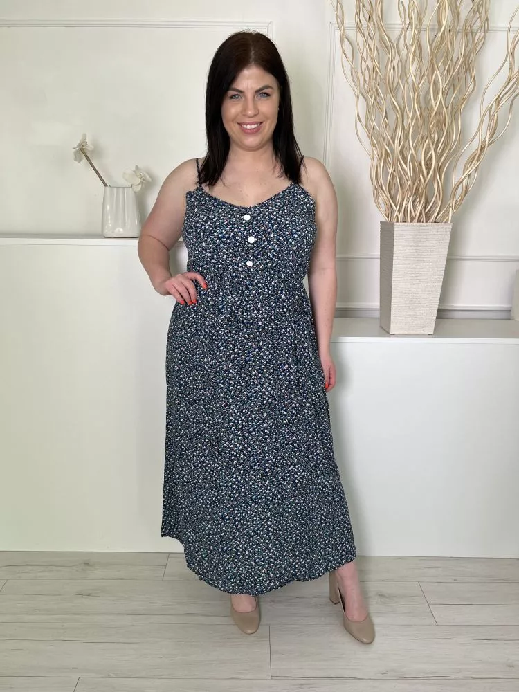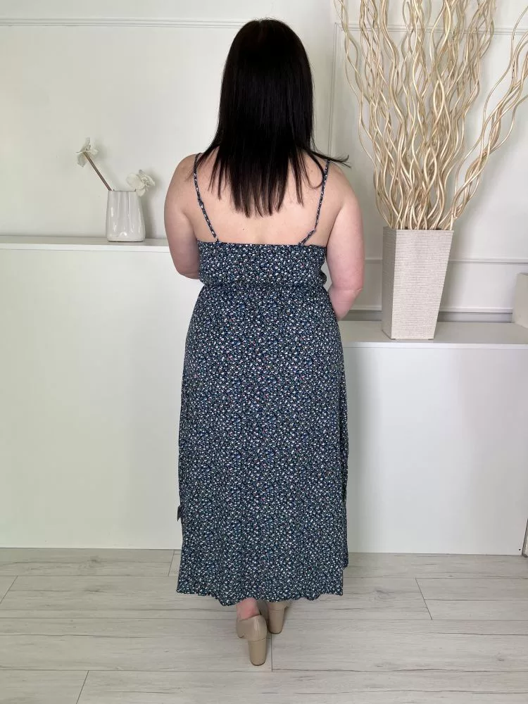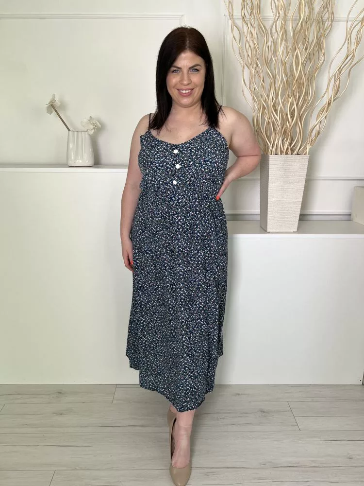 Shein (L) Sötétkék Apró Virágos, Mellnél Díszgombos Pántos Ruha