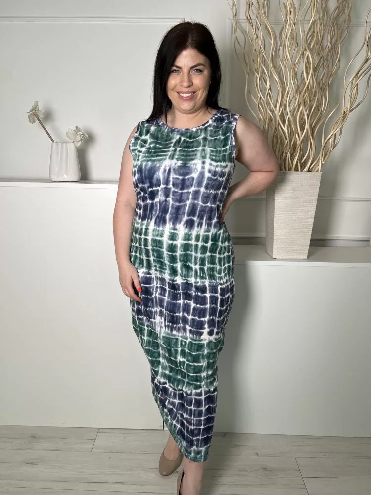 Shein (L) Zöld-Kék-Fehér Mintás, Kerek Nyakú Oldalt Sliccelt Ruha