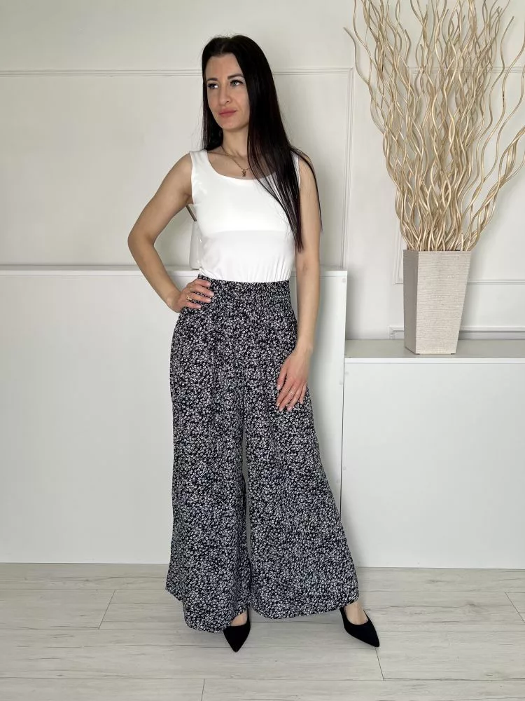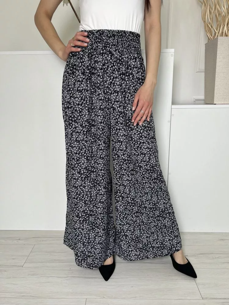 Shein (M) Fekete Apró Fehér Virágos, Derékban Darázsolt Bőszárú Nadrág