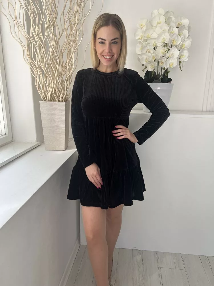 Shein (M) Fekete Tükörbársony Anyagában Bordázott, Kereknyakú Ruha