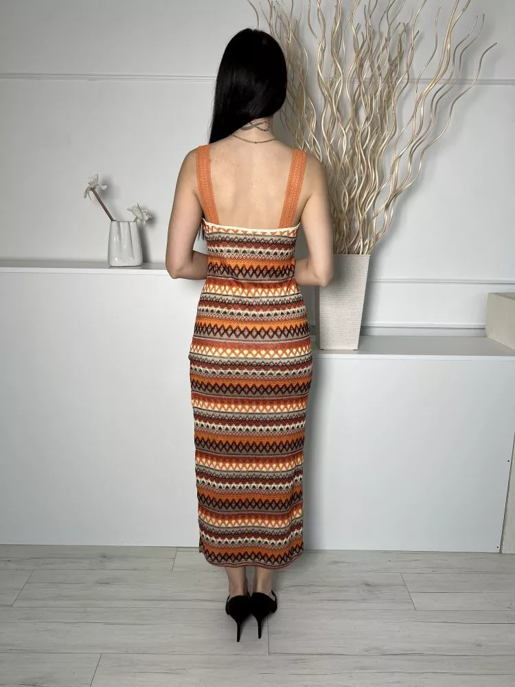 Shein (M) Narancs-Barna-Drapp Mintás, Oldalt Sliccelt Anyagában Horgolt, Bélelt Ruha