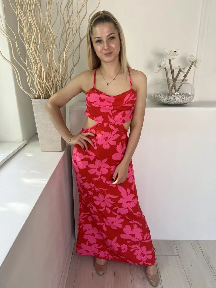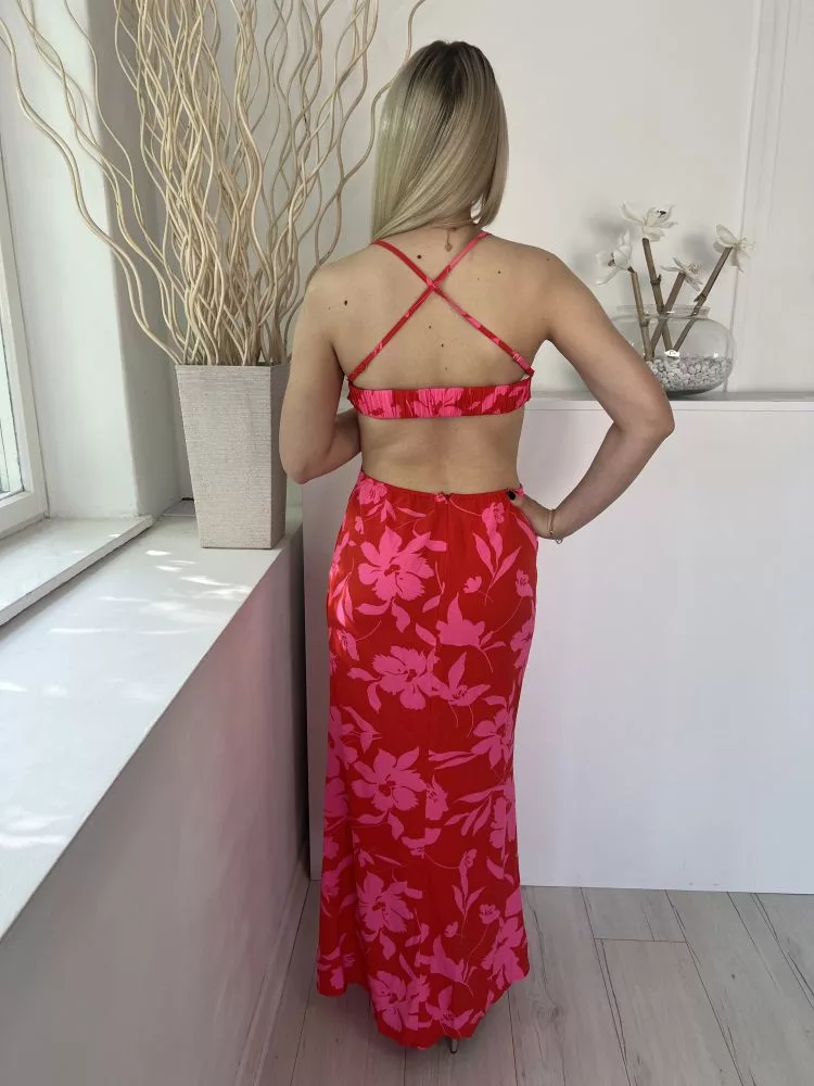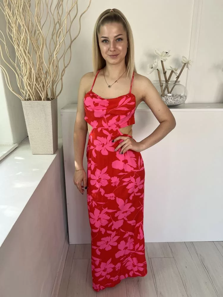 Shein (M) Piros Rózsaszín Virágos, Oldalt Kivágott Hátul Keresztpántos, Cipzáros Ruha