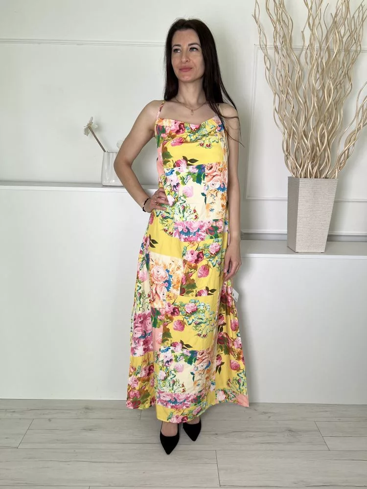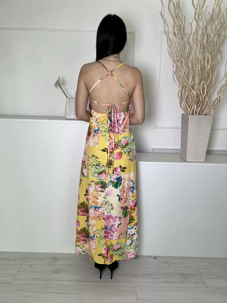 Shein (M) Sárga Színes Mintás,Hátul Nyitott Megkötős, Oldalt Sliccelt Ruha
