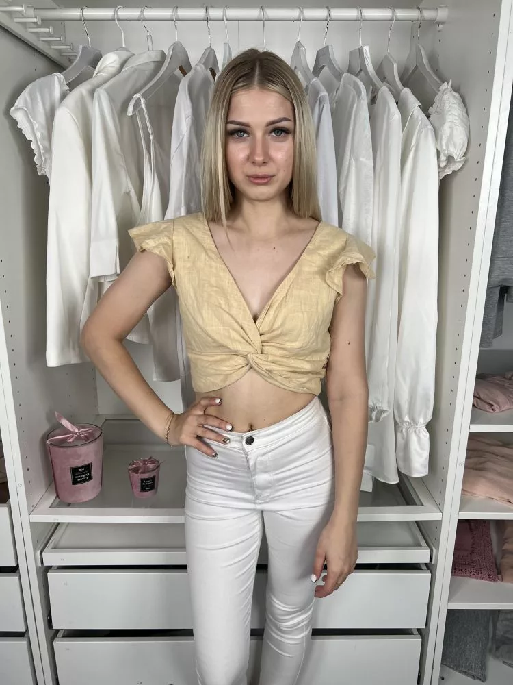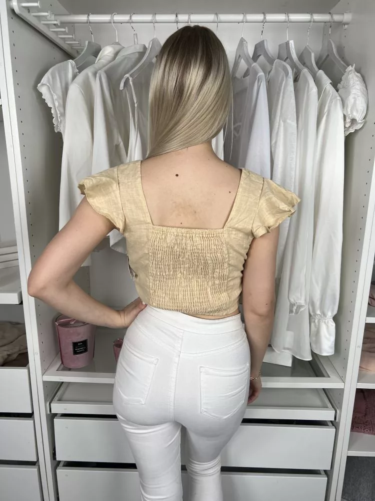 Shein (S) Sárga Hátul Darázsolt, Elől Csavart Fodros Vállú, 100% Pamut Felső