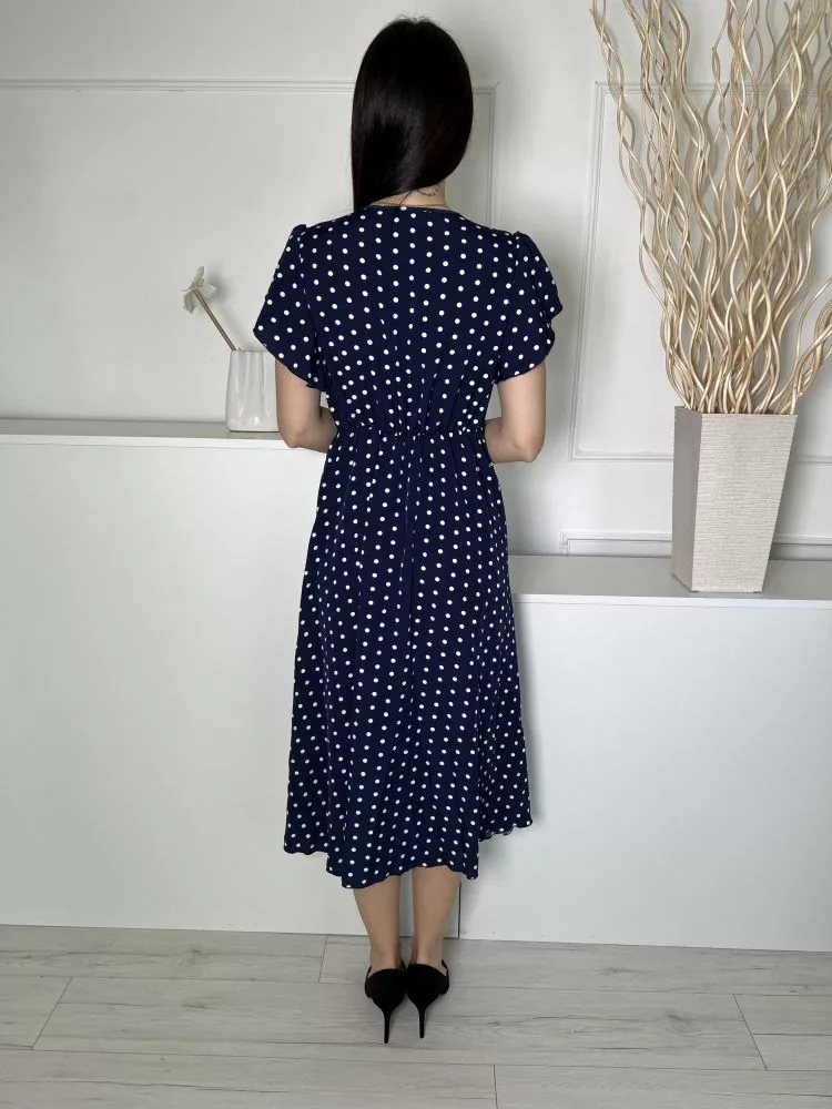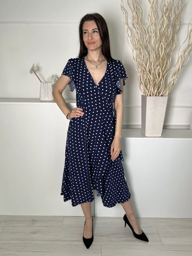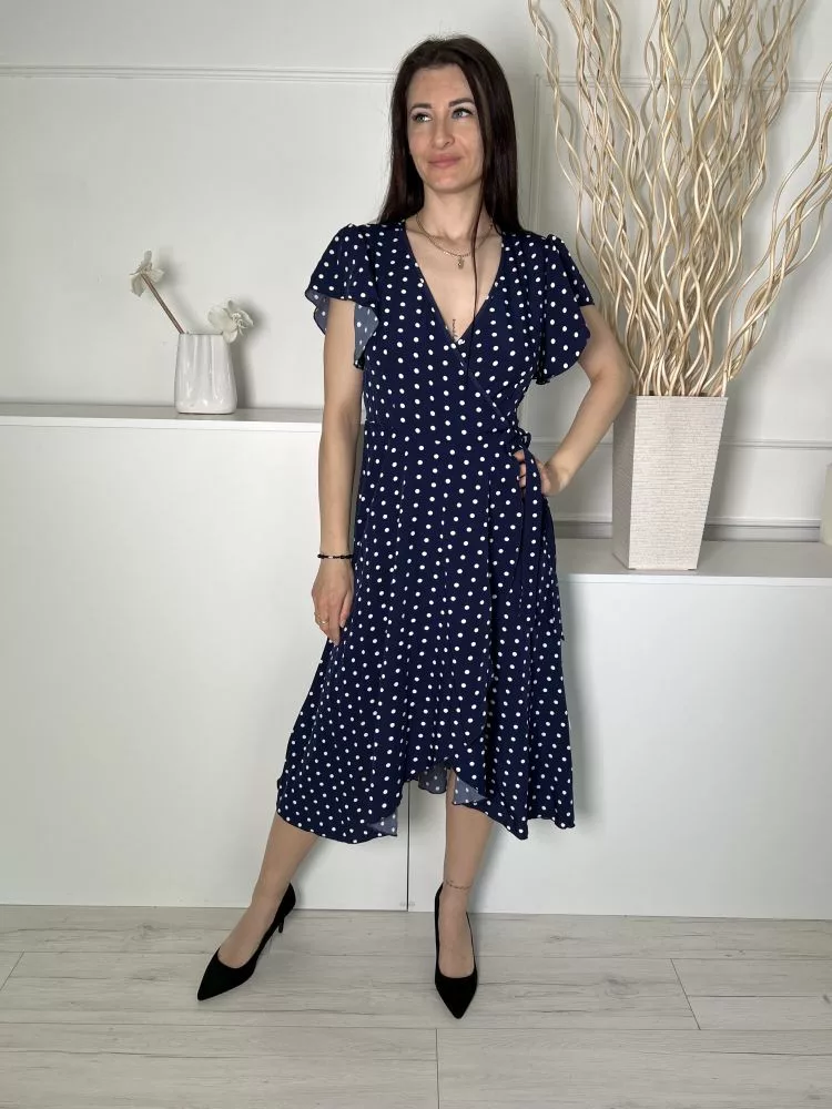 Shein (S) Sötétkék Fehér Pöttyös, Gumisderekú Díszlapolűsú, Oldalt Megkötős Ruha