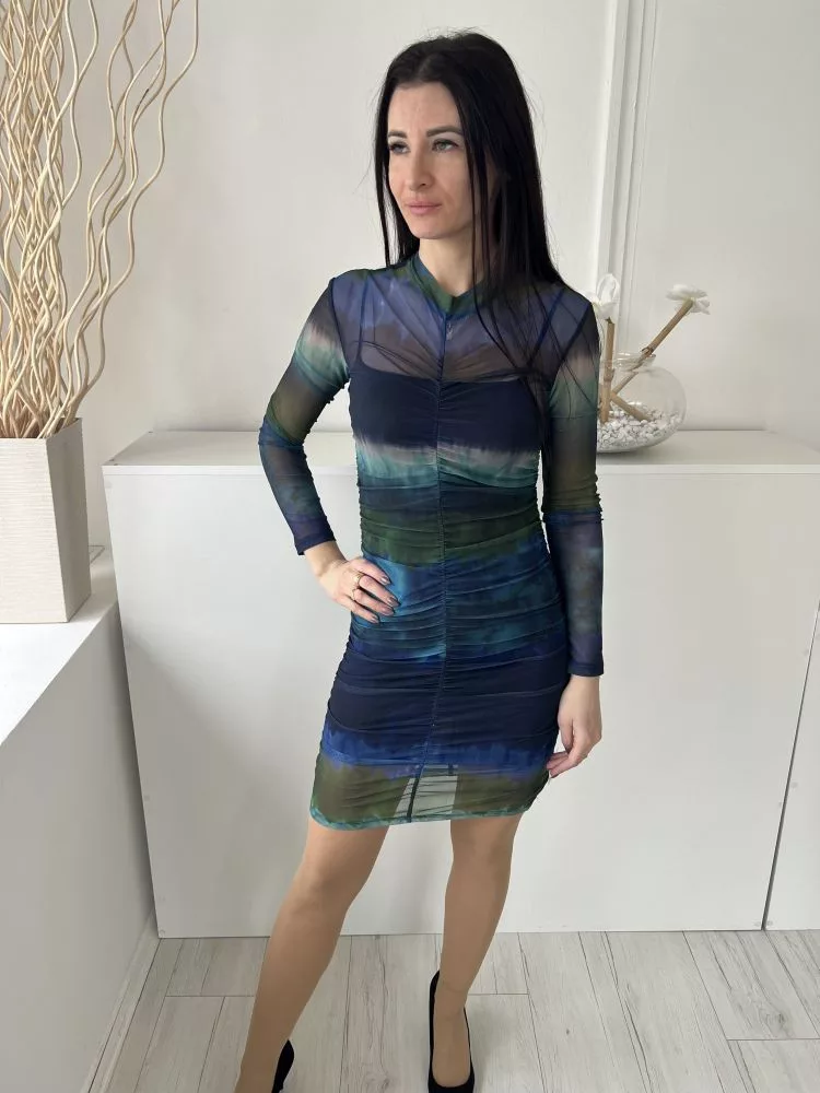 Stradivarius (M) Kék-Zöld-Khaki Kívül Hálós Anyagú, Bélelt Elől Húzott, Kerek Nyakú Ruha