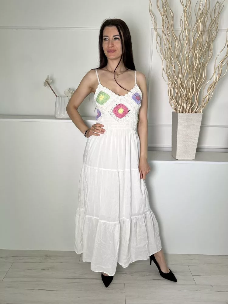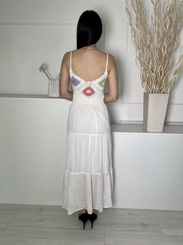 Stradivarius (S) Fehér Felül Horgoltmintás, Darázsolt Pántos, Bélelt, 100% Pamut Ruha