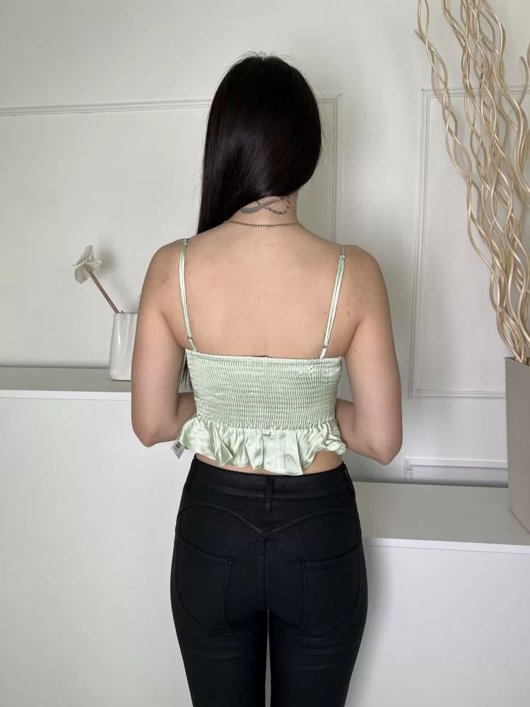 Stradivarius (S) Selyemcukor Zöld Mellnél Megkötős, Fodros Aljú Fényes Anyagú, Hátul Darázsolt Felső