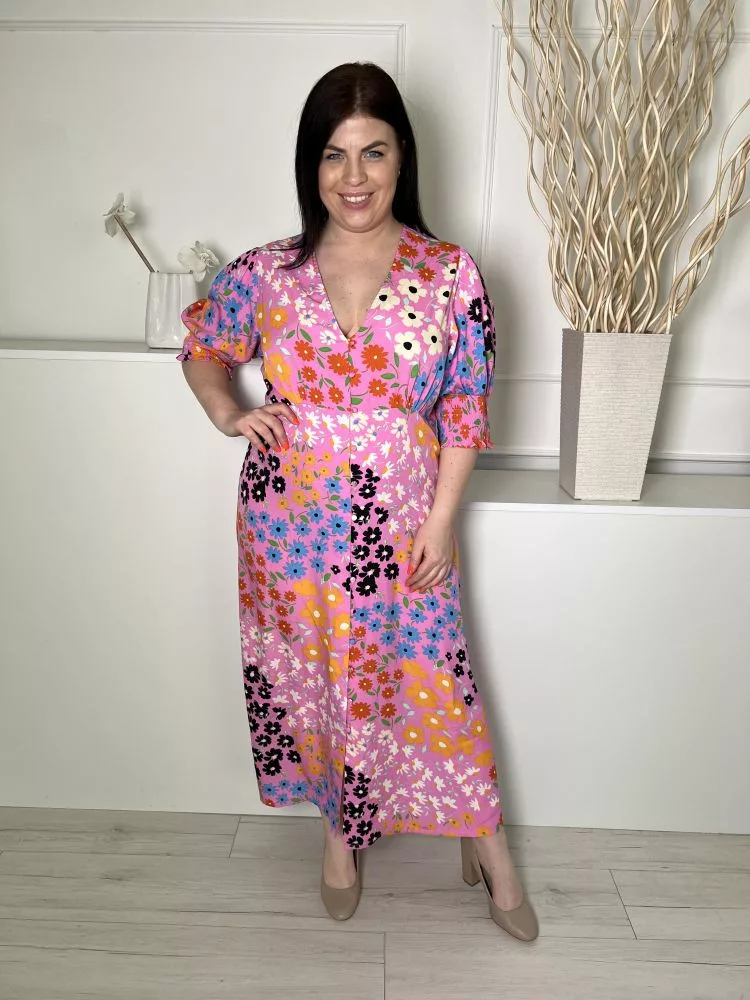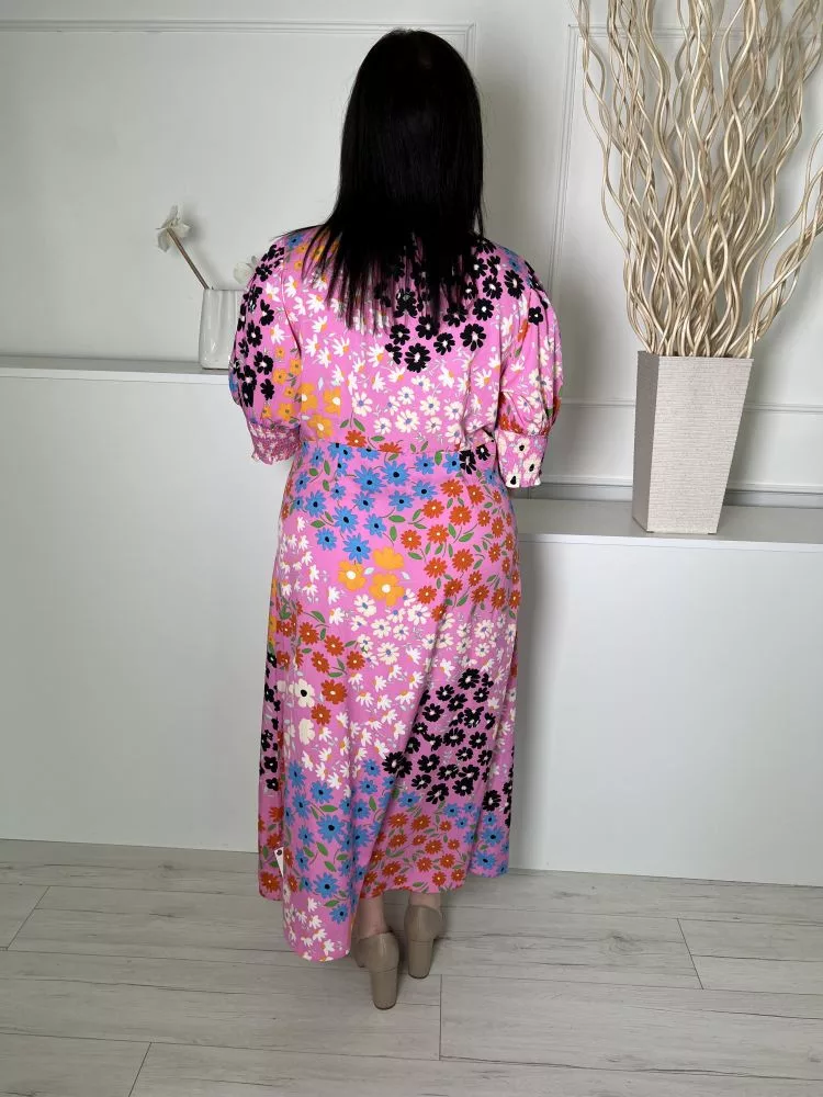 Studio (L) Rózsaszín Színes Mintás, Elől Végig Gombos Darázsolt Ujjvégű Ruha