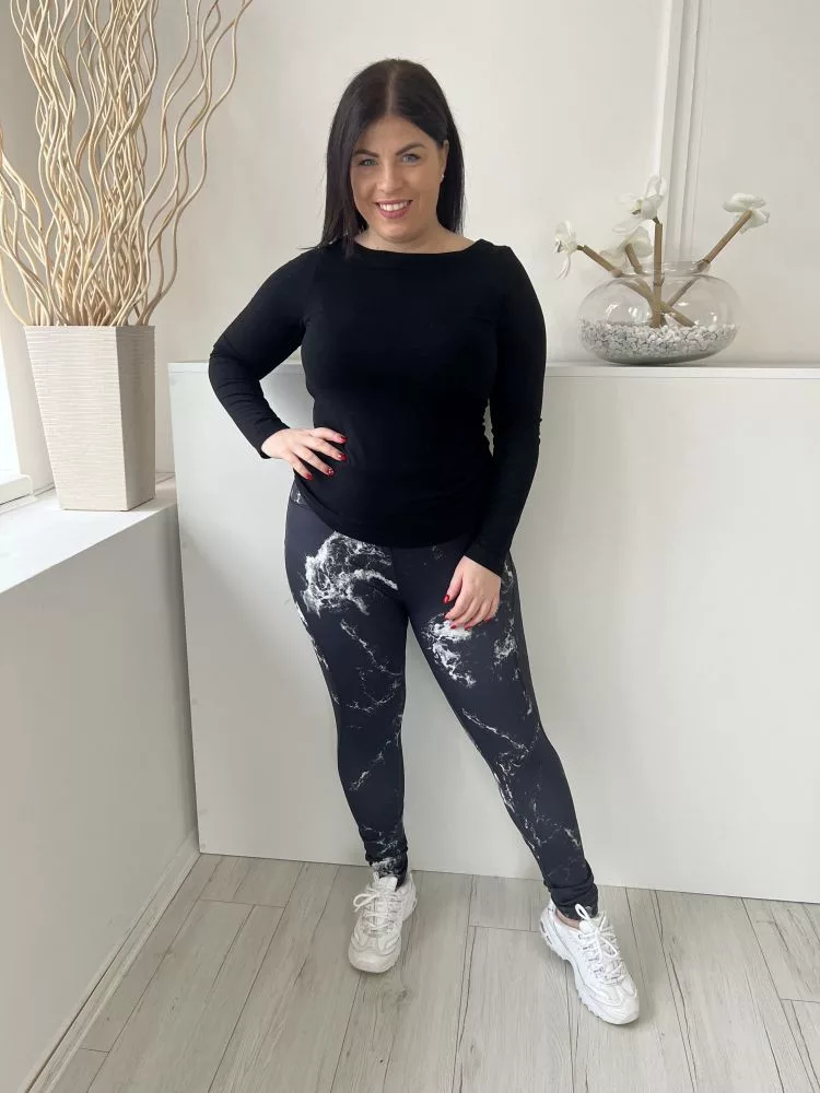 TU (L) Fekete Fehér Márvány Mintás Gumisderekú, Rugalmas Anyagú Nadrág
