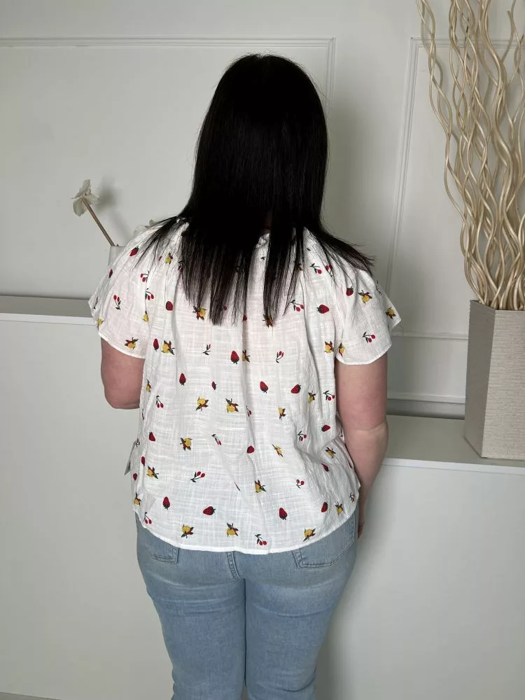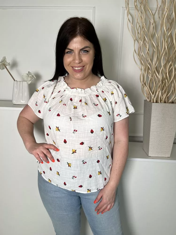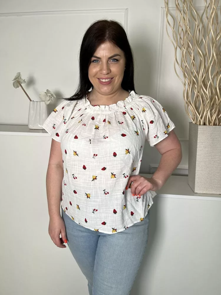 TU (M) Fehér Apró Gyümölcs Mintás, Enyhén Áttetsző Fodros Nyakú, 65% Pamut Felső
